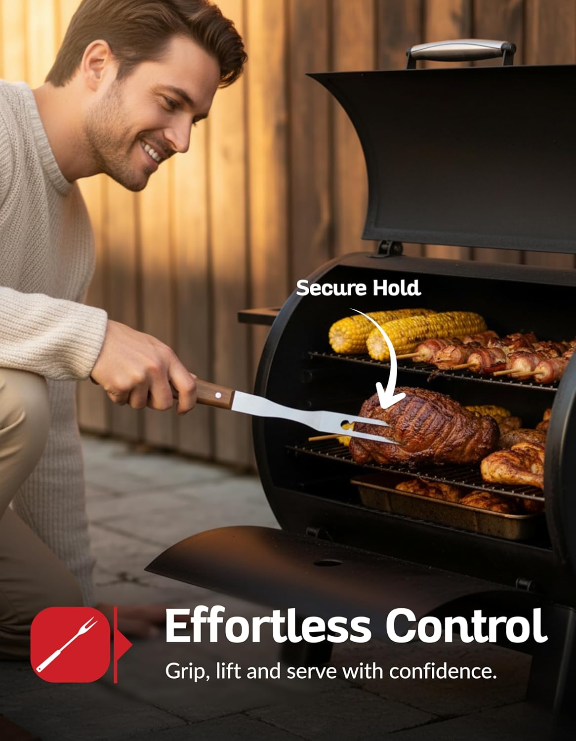 Ergonomic Handles for Comfort & Safety – Our professional BBQ spatula, fork & tongs are designed with heat-resistant, non-slip handles for comfort and safety. The ergonomic design prevents hand fatigue, while the extra-long handles keep you safe from flames. These grill utensils provide a comfortable grip suitable for all skill levels, making every barbecue session effortless.
