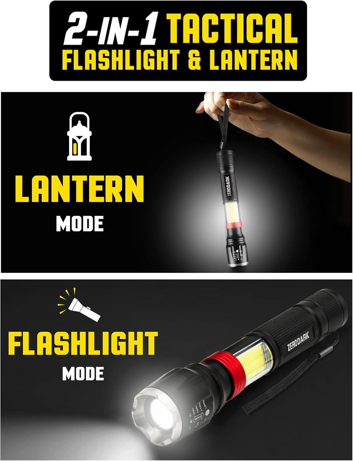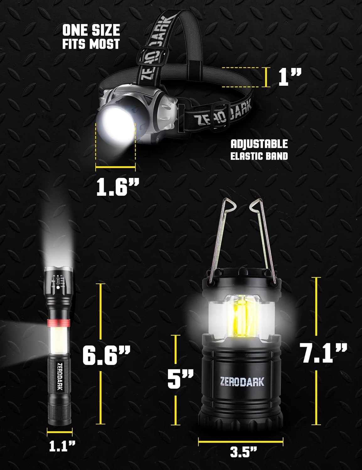 The ZeroDark 3 Piece battery powered led lantern + tactical flashlights high lumens set includes: 1 battery operated lantern, 1 led flashlight, and 1 Headlamp with all batteries included. provides you with bright camping lights lighting when you need it, outdoors, camping, fishing, or any dark environment