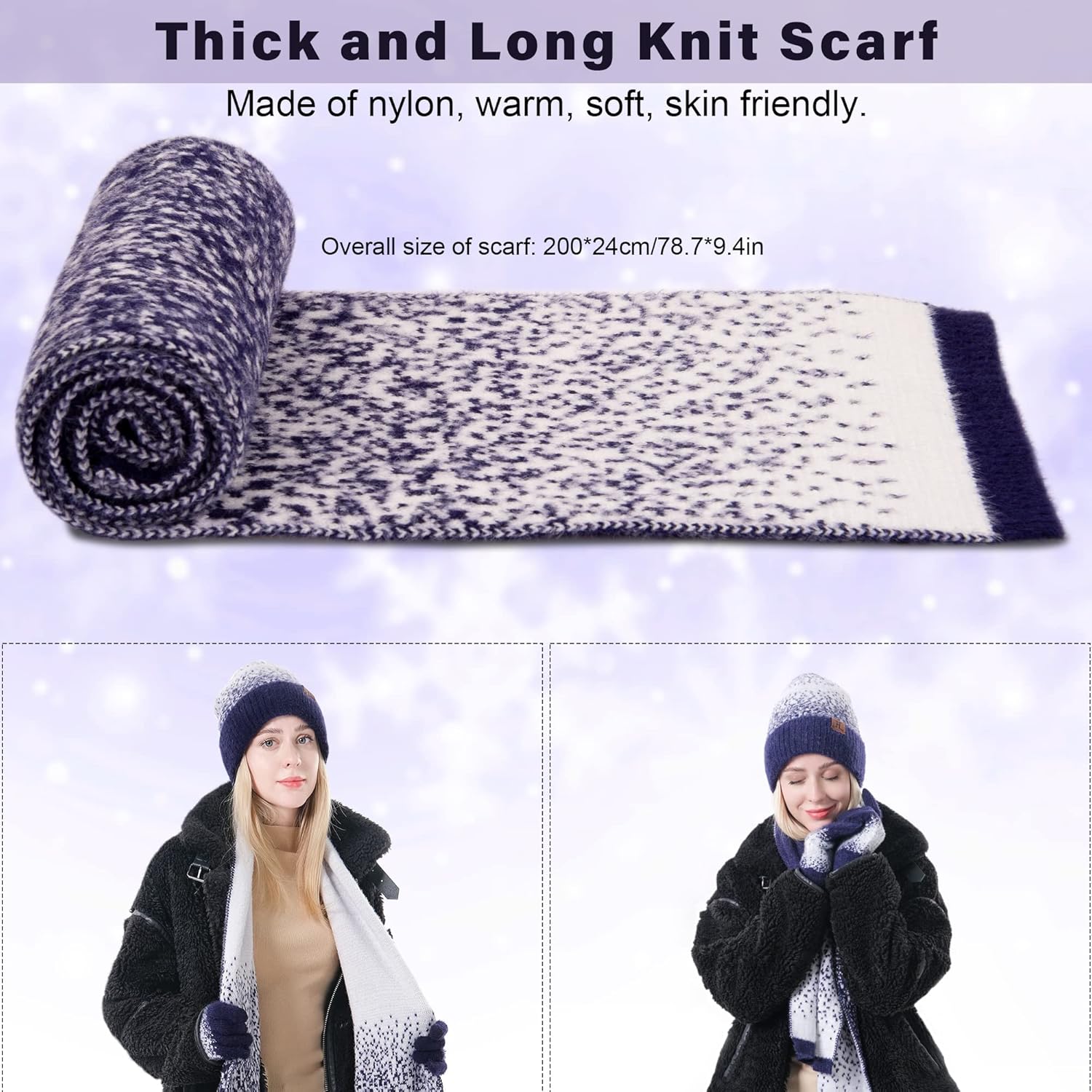 The hat and scarf and glove set features in snowflake pattern, very suitable for your winter suits and best gift for Christmas, birthday and so on.