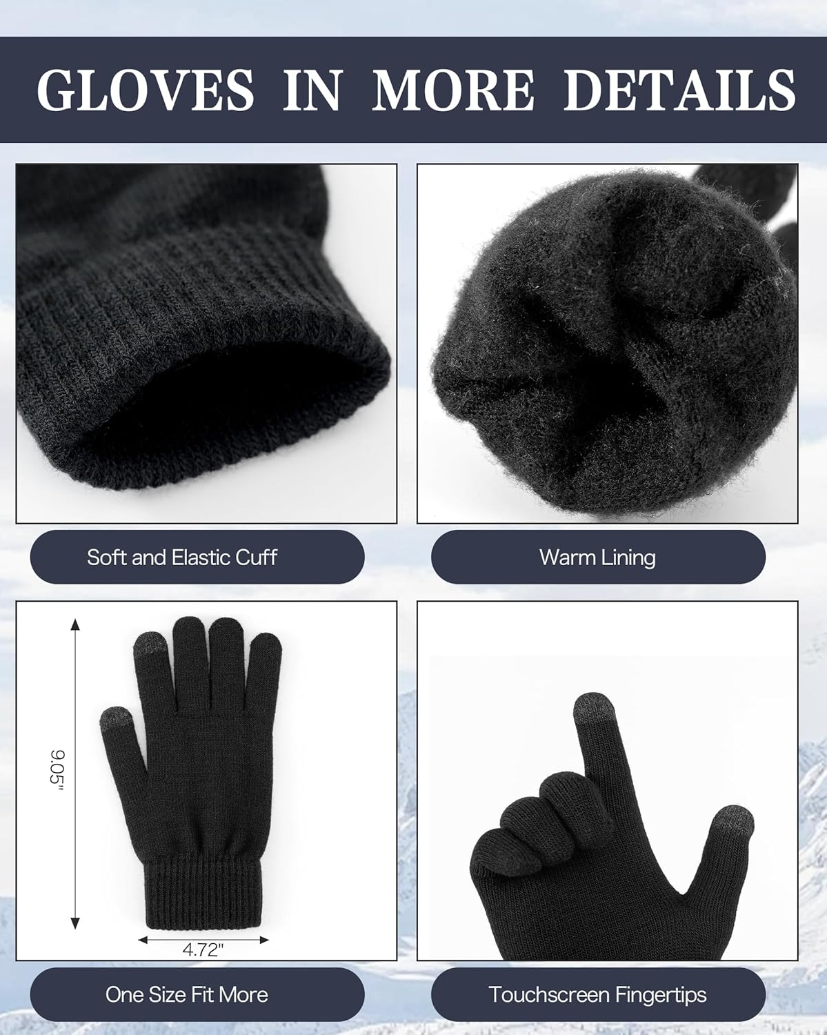 One size fits various head shapes and hand sizes, and it’s easy to wear or take off. The beanie hat and winter gloves have good elasticity and fits most people. The extended scarf is thick and comfortable, it keeps your neck warm. They have enough elasticity and snug fitting to make you stretch freely and comfortable to wear.