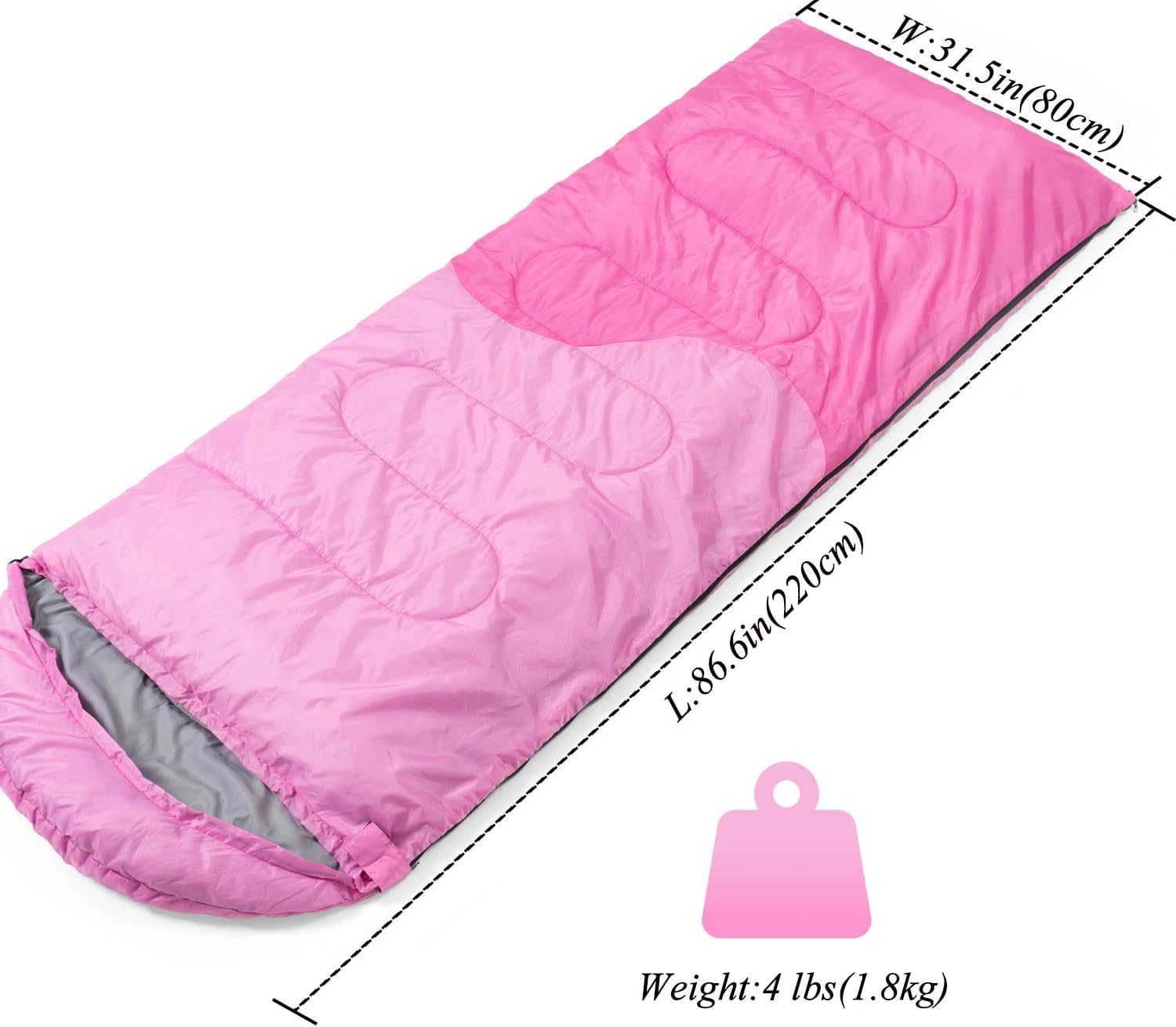 Roomy and Lightweight:The size of the sleeping bag is 86.6 x 31.5 inches(220 x 80 cm).Pack weight is about 4 lbs.It could be fully opened to be a blanket for picnic or play.Convenient to carry along for any outdoor adventures with the carry bag