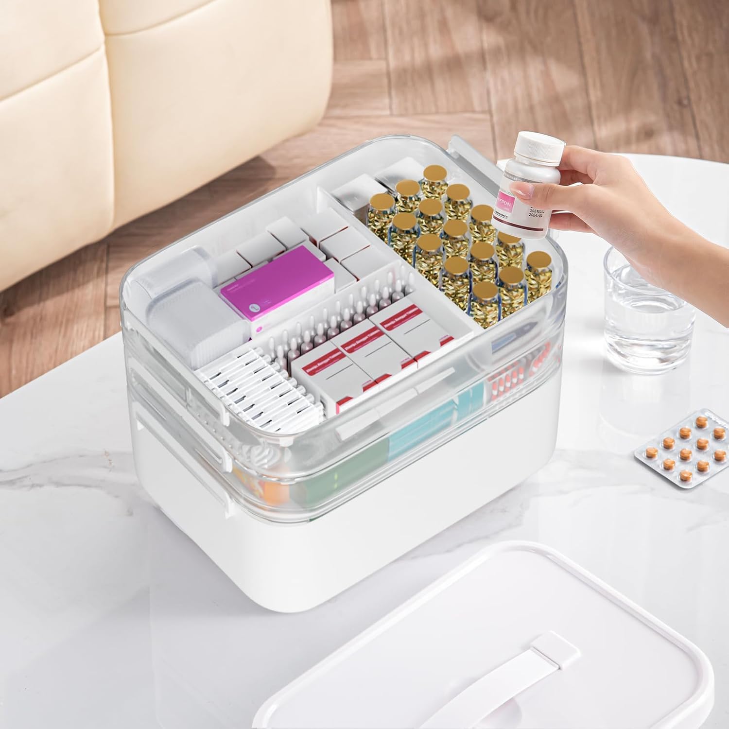 Quick-find design: The top two layers of the first aid box feature a transparent design, with 3 separate compartments per layer to keep meds organized and find your meds easy. The deeper bottom layer allows large bottles to stand upright.