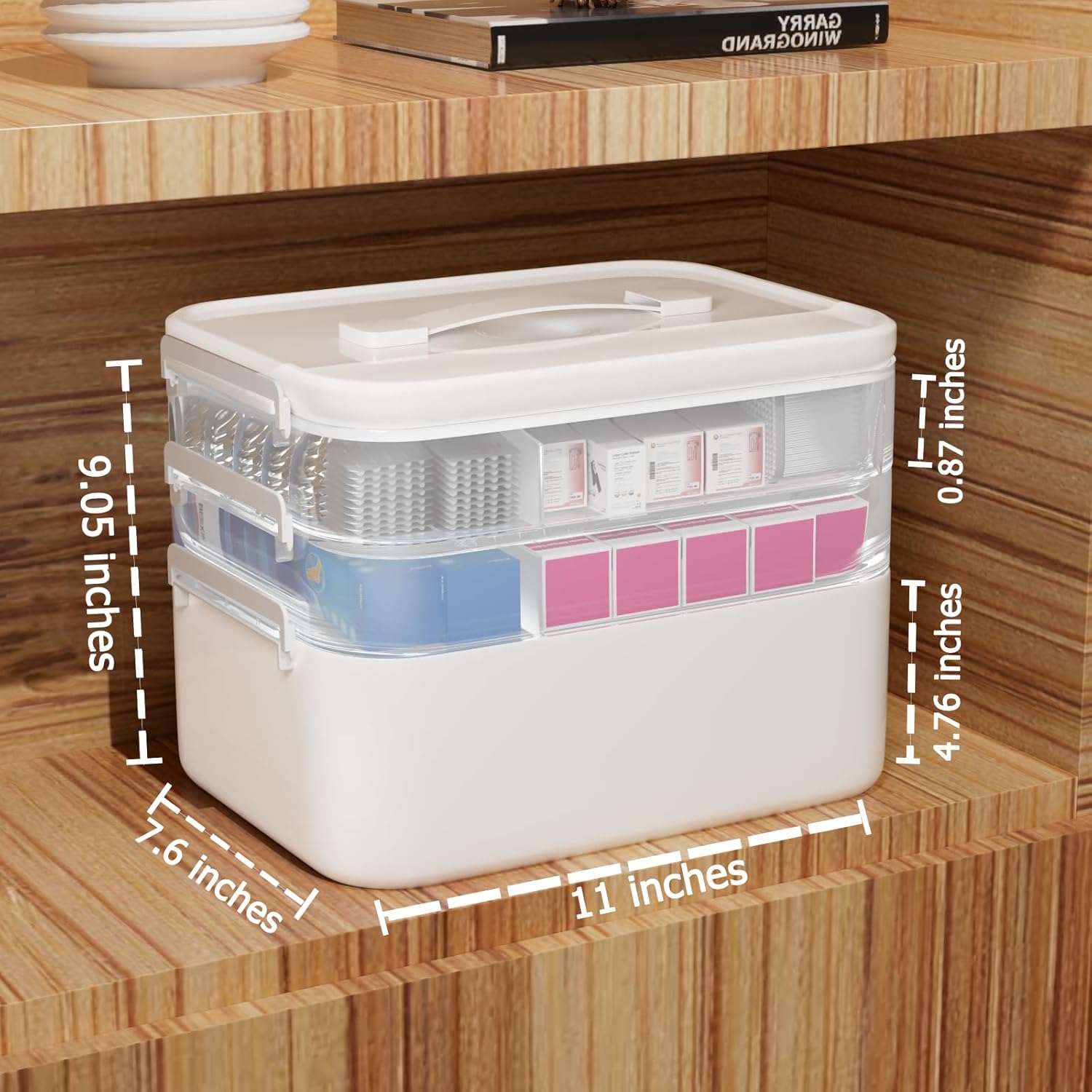Easy medicine storage: The medicine storage box adopts a three-layer design with a size of 11″L*7.6″W*9..05″H. which is enough to store medicine bottles, ointments, thermometers, cotton swabs, alcohol pads, Band-Aids, bandages, etc.