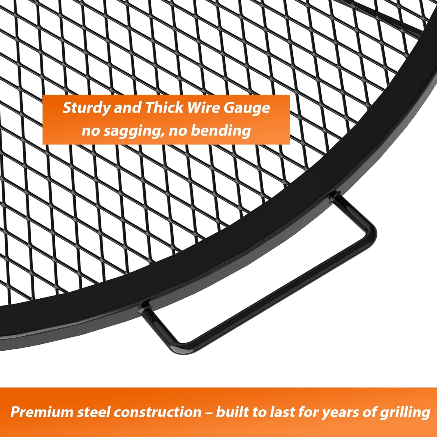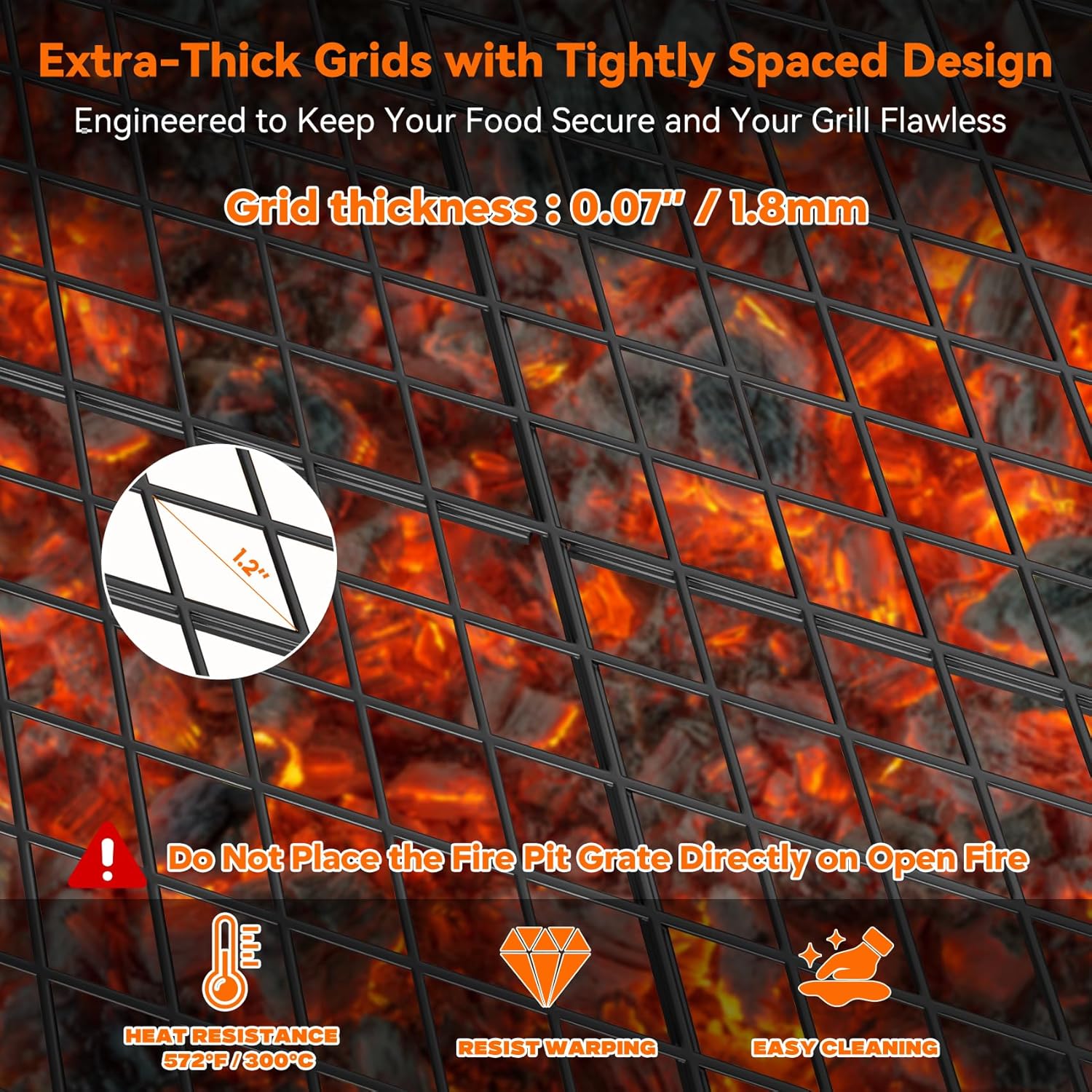 【Heavy-Duty Steel with 572°F Resistance】 Constructed from premium heavy-gauge steel with a durable high-temp coating (resisting up to 572°F), this grate offers excellent heat retention. For best results and to protect the finish, we recommend placing the grate over hot charcoal, embers, or a bed of ash rather than directly on open flames. This method ensures even heating and prolongs the life of the coating.
