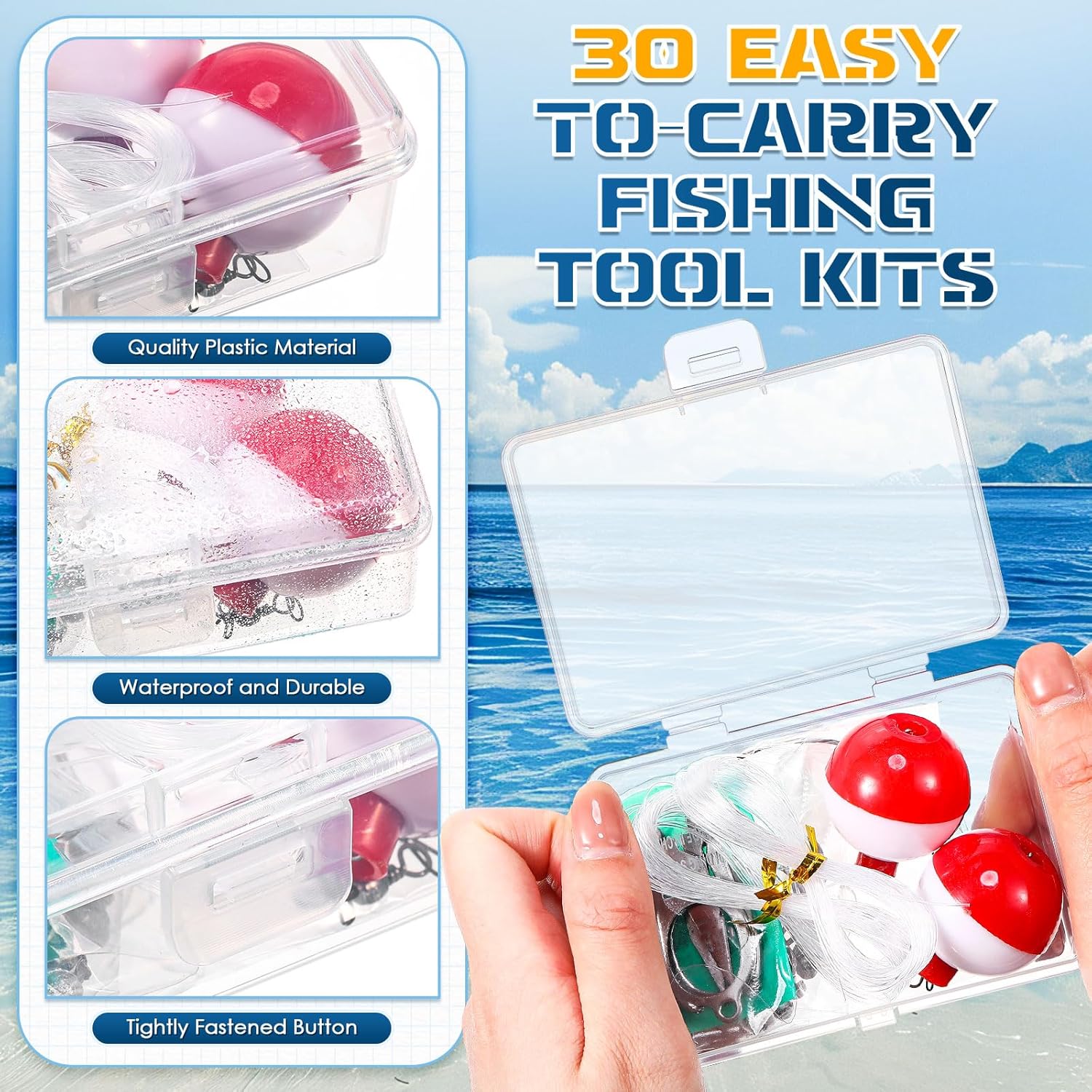 Package Includes: you will get 30 sets mini fishing kits, each set contains essential accessories such as 2 pieces of glow in the dark soft bait, 2 bite proof lines, 10 fish sinkers, 6 fish hooks, 2 floats, 2 fishing lines, 1 pair of folding scissors, and 1 transparent plastic storage box, ensuring that the fun of fishing and the excitement of survival scenarios can be enjoyed anytime, anywhere in nature