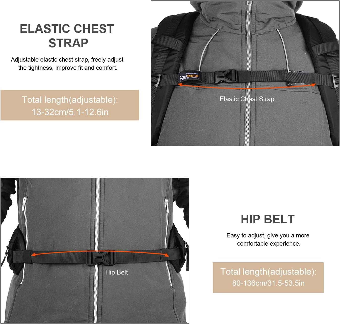 【Unique Functional Design】:The main pocket of the camping backpack has a strap for binding the water bag liner and a hose hole on the top side for assembling the water bag system; the side straps and buckles can be used to fix water bottles or trekking poles, and the bottom straps can be used to fix a tripod or a sleeping pad.