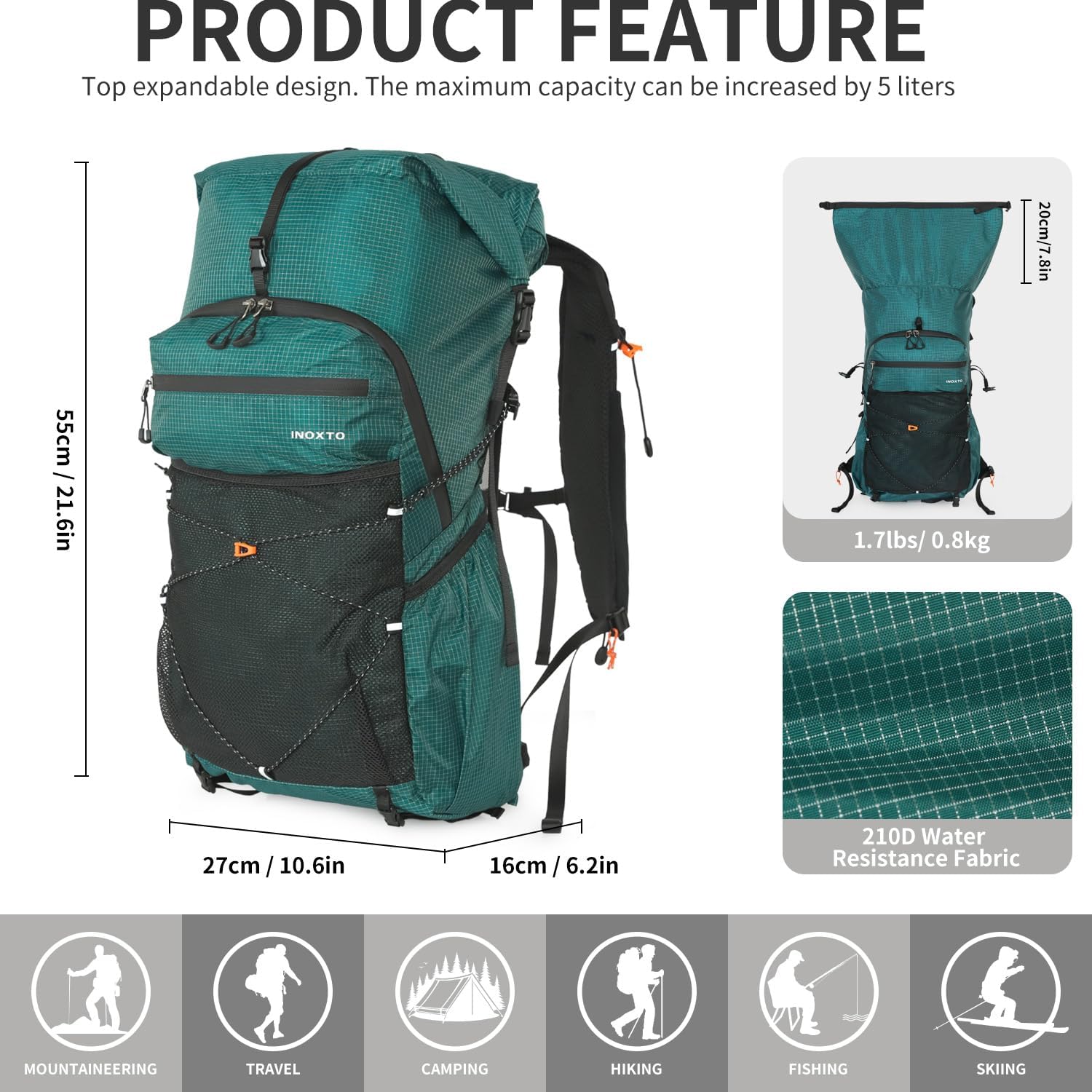 【Ergonomic Design】Our Camping Backpack are 21.6 x 10.6 x 6.2 inches, 25+5L,Weight 1.7lbs. Features a cutting-edge 3D touch suspension system that keeps your back comfortable and relaxed during travel. Breathable mesh on the back fabric can reduce sweating for extra comfort.Using steel frame support, the force is more evenly distributed, can reduce the fatigue of carrying for a long time.Reflective design increases visibility and makes it safer at night.