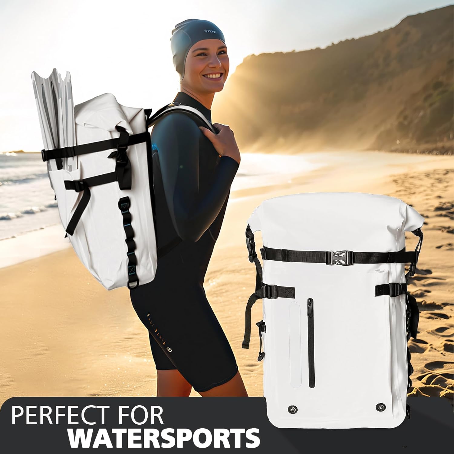 【LARGE CAPACITY】 This snorkeling backpack has 30L capacity providing ample room for essentials without weighing you down. Includes a large open outer pocket for bulky items like fins,wet swimsuits, or muddy shoes,a mesh pocket for water bottle,and a splash proof zipper pocket for smaller essentials. Padded back and shoulder straps, and adjustable waist and sternum straps provide stability and comfort
