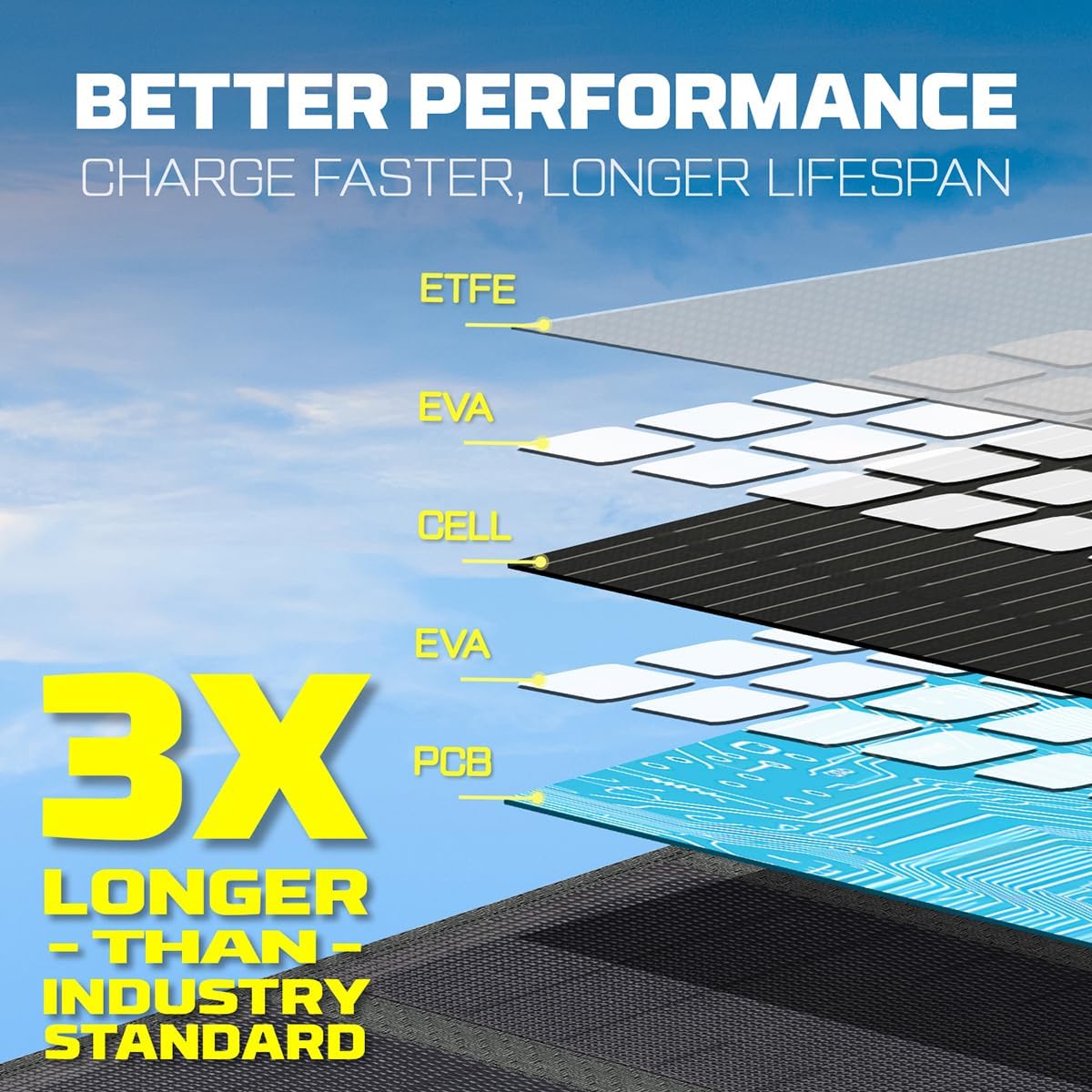 Utilizing high-efficiency monocrystalline silicon solar cells (Soft Monocrystalline Cells) and a durable ETFE outer protective film, it offers high conversion efficiency and durability, designed for harsh outdoor environments.