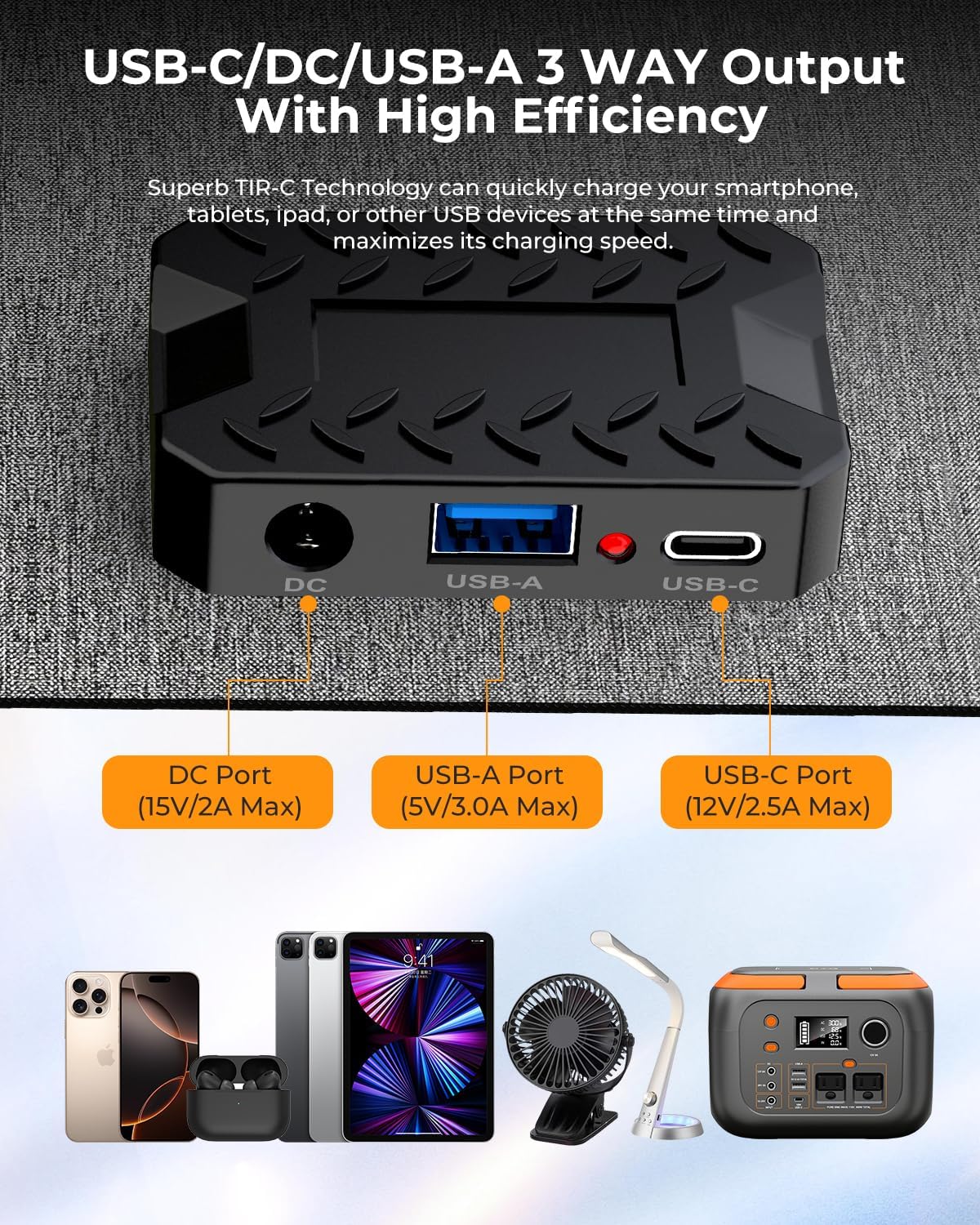 Multi-Output Port Design: This solar panel charger features multiple output ports, providing diverse charging options. You can charge multiple devices simultaneously: 1 x USB-A port, 1 x Type-C port.This solar panel charger can quickly power up your smartphone,kindle,tablet, power bank, speaker, iPad, GPS device, USB fan, camera, and other USB devices.