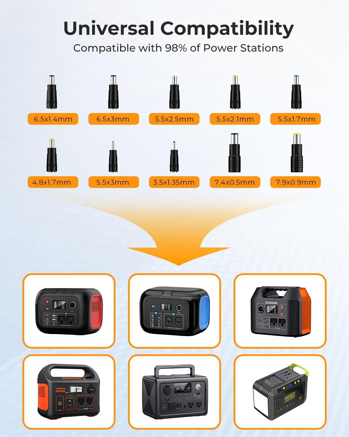10-in-1 Adapter: This solar panel is equipped with 10 adapters .These adapters make this 30W foldable solar panel an ideal choice for outdoor use and pairing with portable power stations and solar power generation systems.
