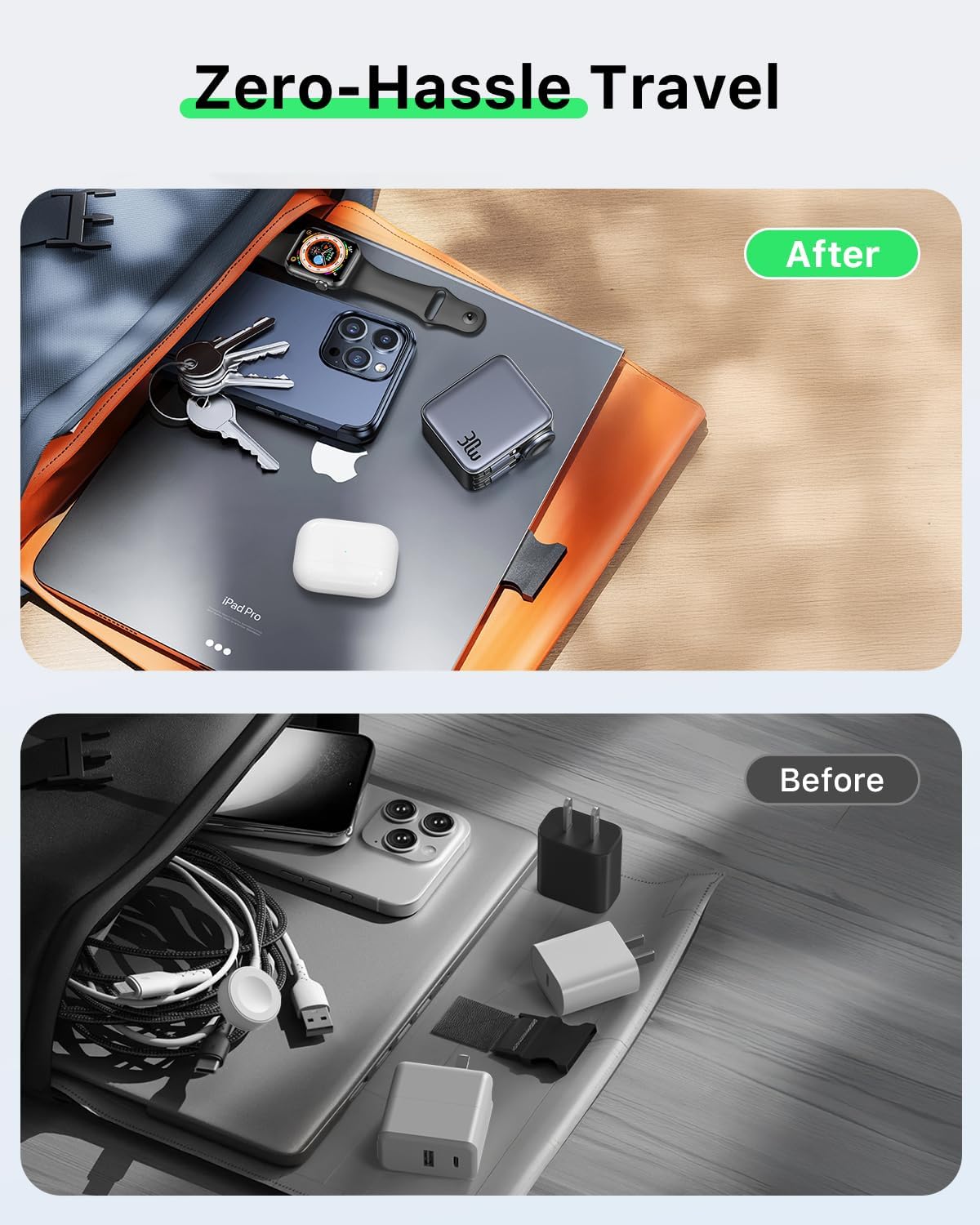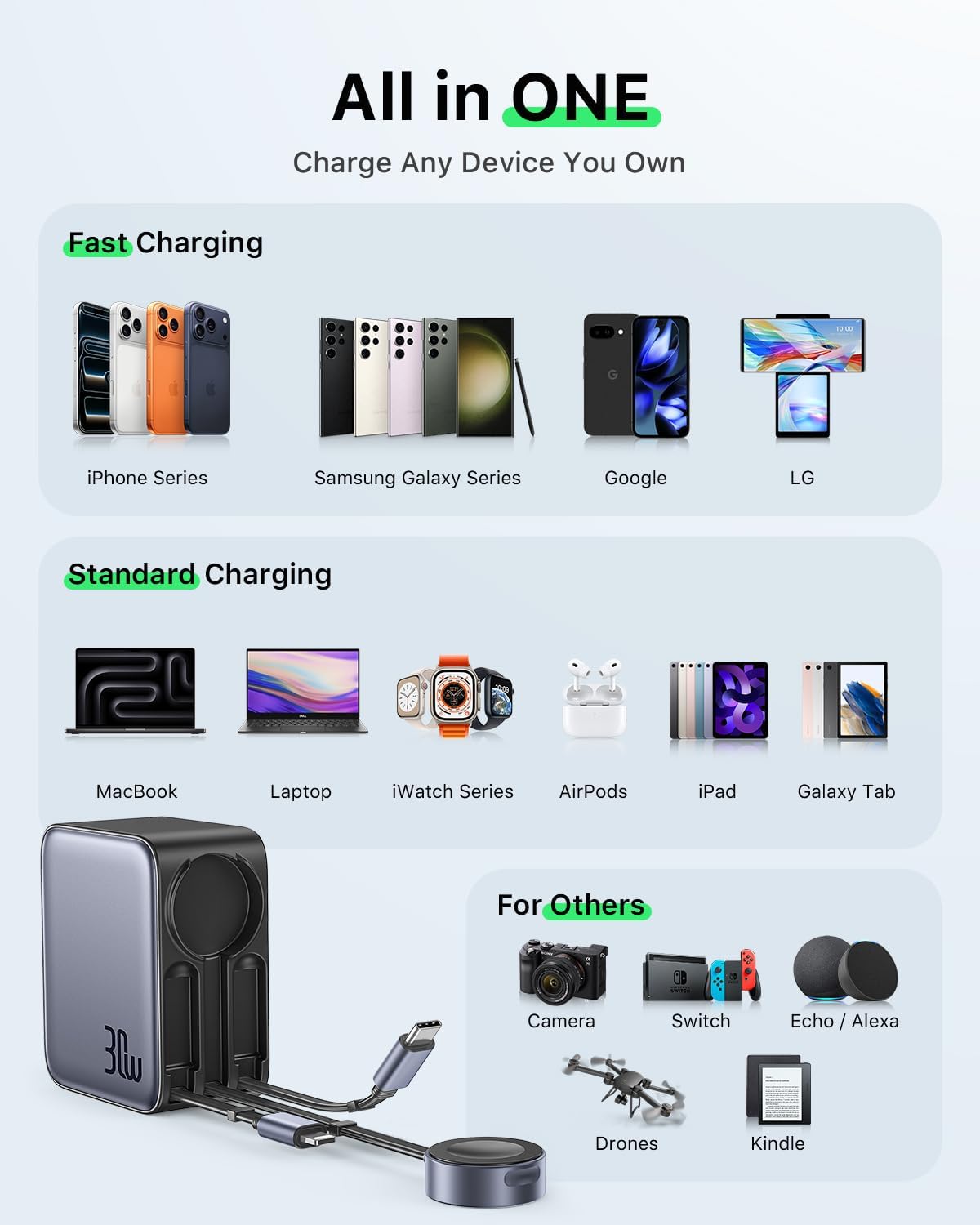 【3 in 1 Retractable Wall Charger】Equipped with 30W high-power retractable charger wall plug with three multi charging cables , you can quickly charge three devices simultaneously by plugging it into a single outlet. Our iPhone charger reduces the number of wires and adapters, making it easier than having to carry a separate charging cable for each device.