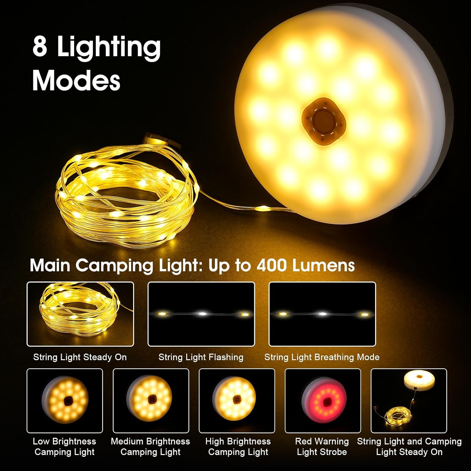 4. 8 Lighting Modes for Any Scenario LED camping string light with 8 modes: steady, flashing, breathing string light; multiple brightness work light levels; red warning flash; and combo mode. Great for camping, emergencies, Christmas décor, parties, and outdoor gifts.