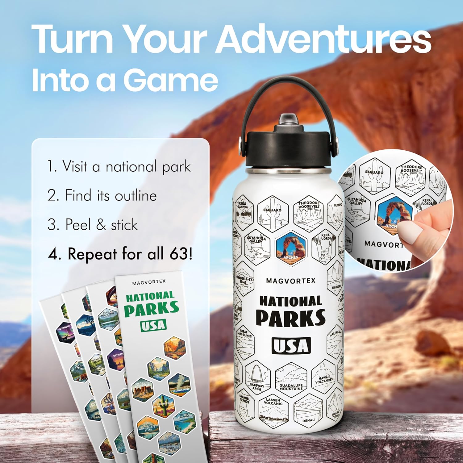 Adventure Tracker with Stickers: Explorethe USA National Parks with this insulated thermal water bottle and waterproof national park stickers. Create your bucket list bottle by marking each park you visit. Ideal for hiking, gym, camping, and road trips