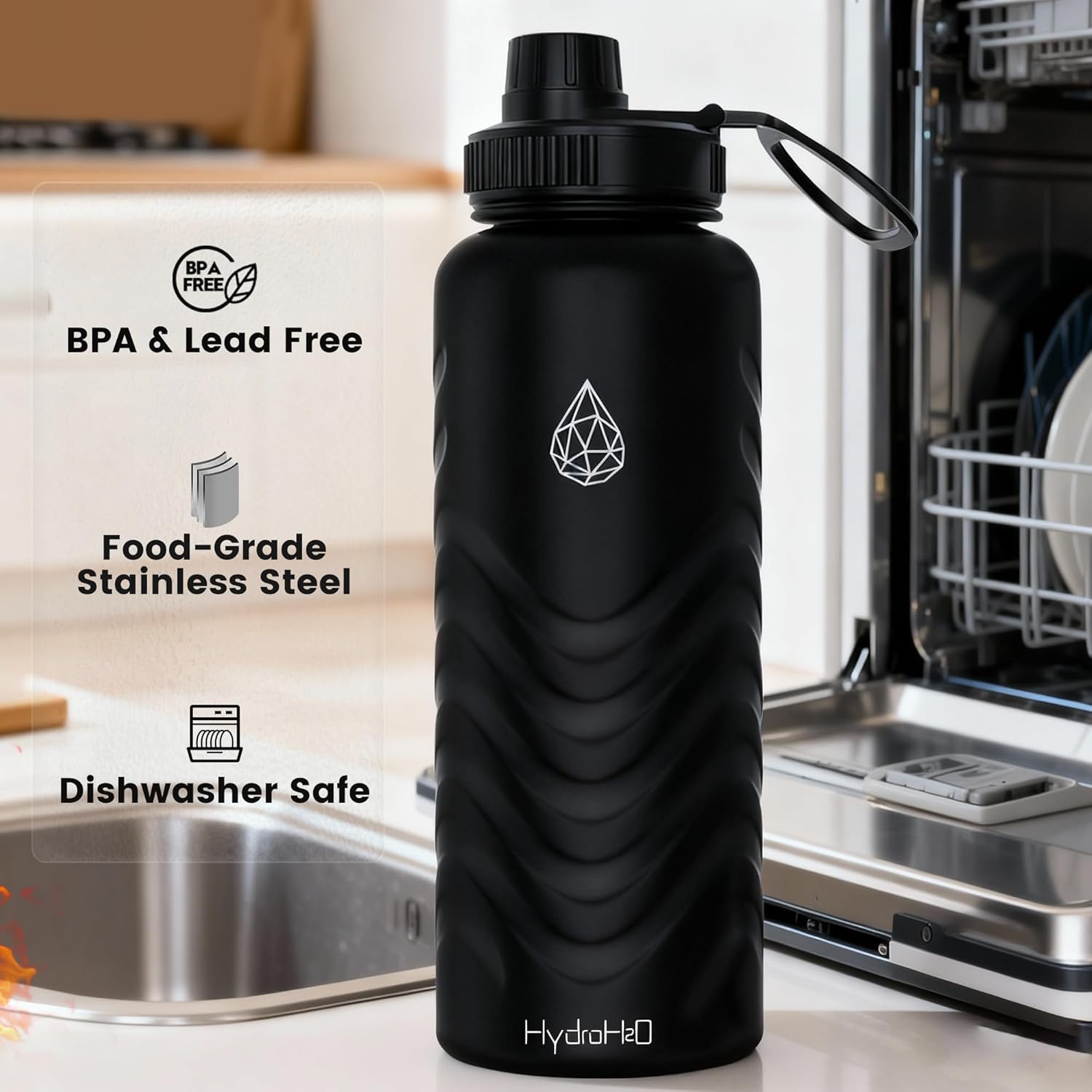 LEAK-PROOF & ERGONOMIC DESIGN: Premium silicone ring is prevents leaks even when tilted. Our sweat-proof water bottles deep-textured grip ensures secure one-handed use during fitness or runs. A nice gym water bottles for men.