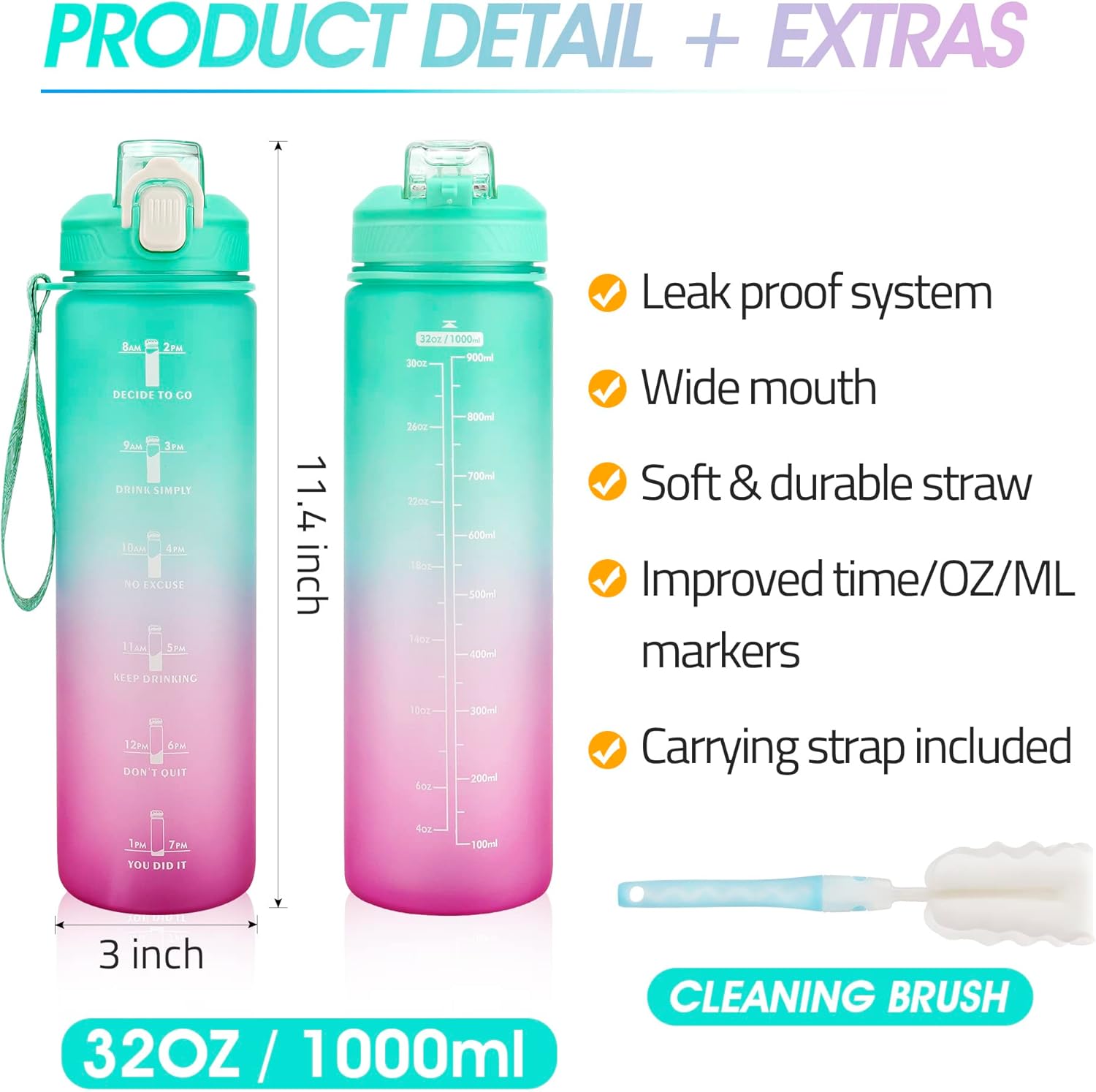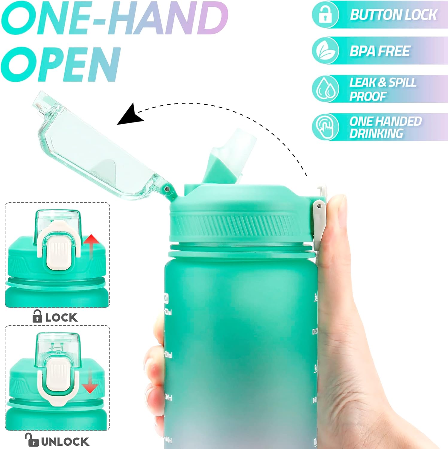 Leakproof & Functional Design – Simply open with one hand by clicking the button, The flip-top lid is designed with a secure lock, making it dust-proof and leak-proof. The water bottle with a straw makes you drink more easily. The wide mouth is easy to fit ice cubes, and also easy to clean. (bonus cleaning brush)