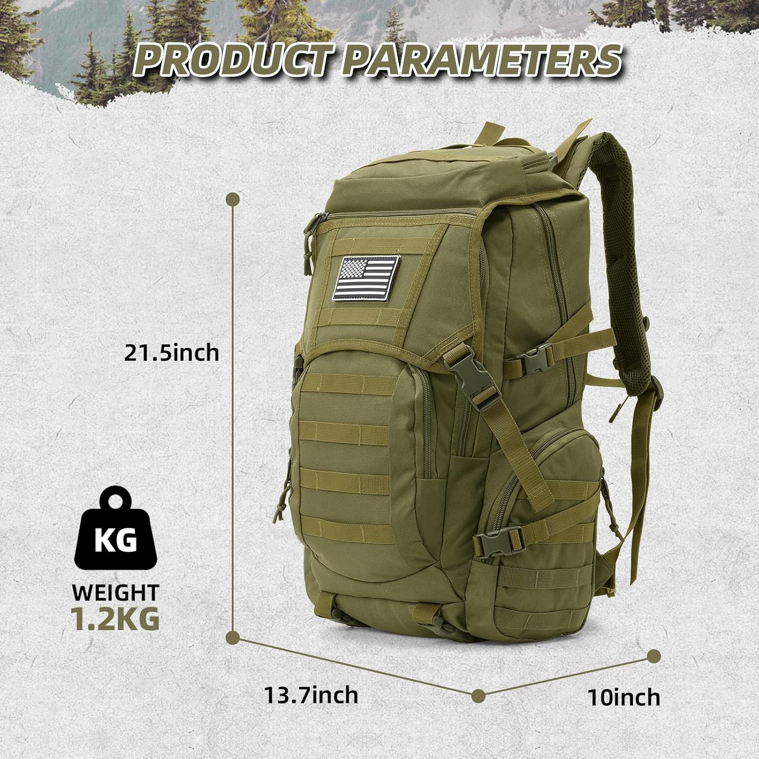 Durable & Weather-Resistant: Military Backpack made from 900D polyester fabric with 1050D waterproof base and reinforced stitching at stress points. This heavy-duty backpack withstands harsh conditions, ensuring your items stay protected during adventures.