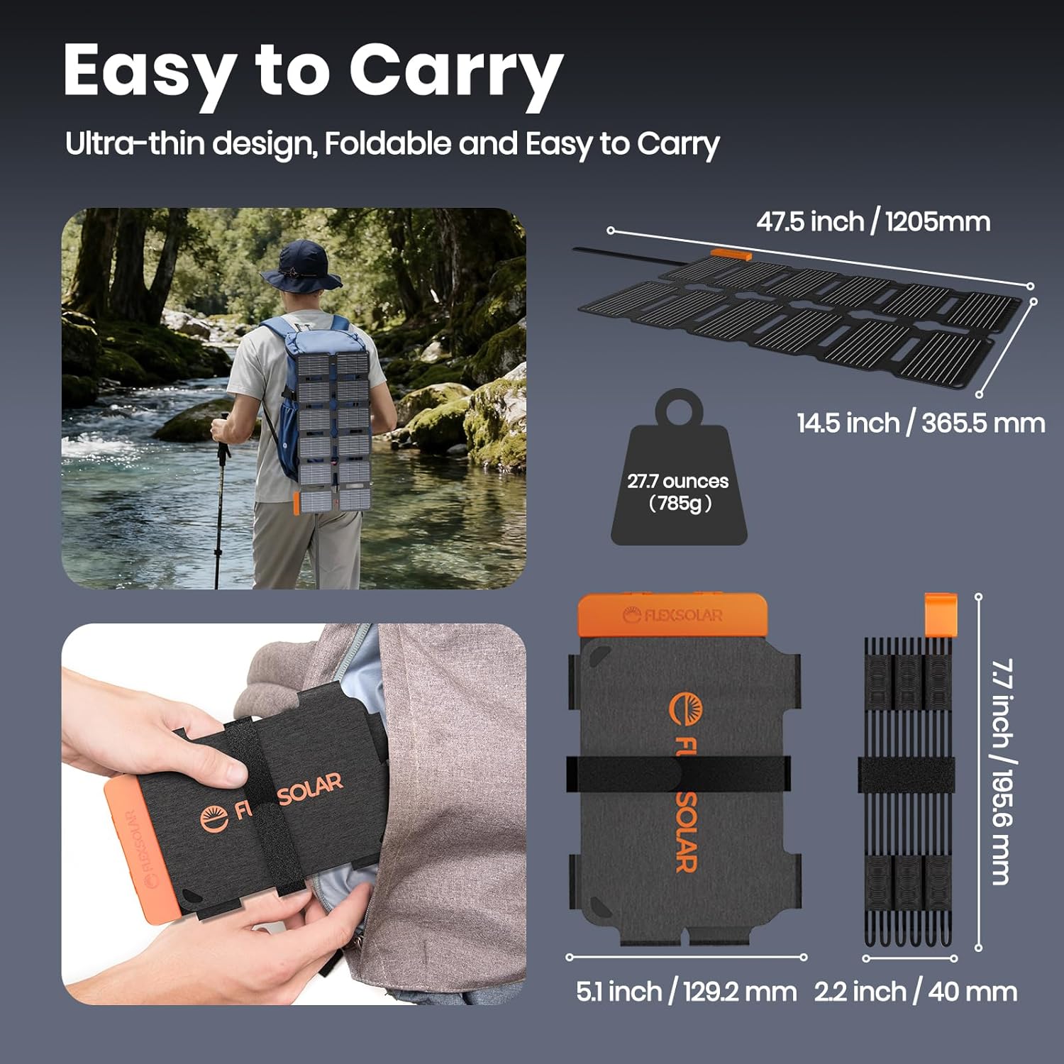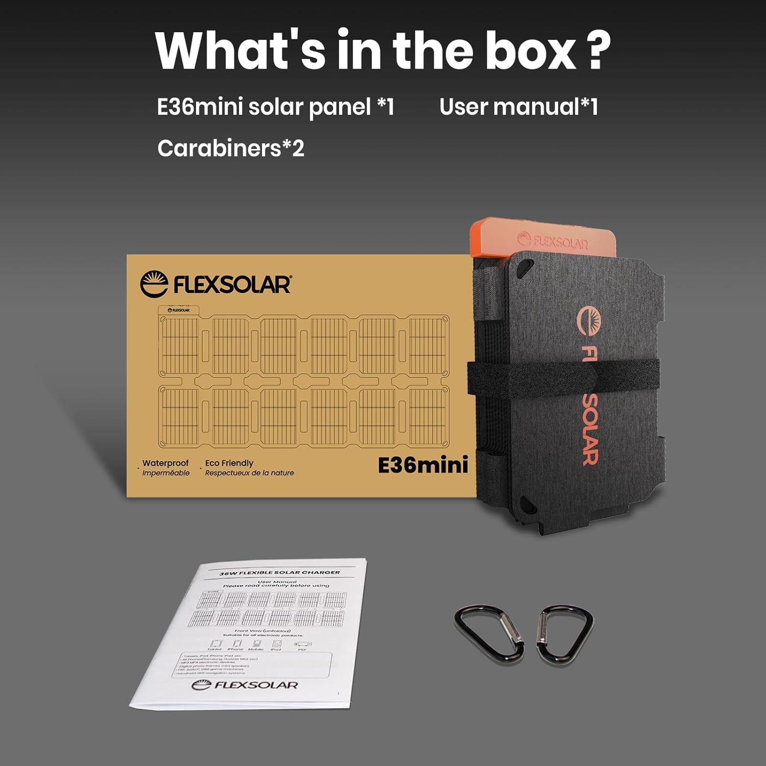 【Super Portable】 FlexSolar 36W flexible solar charger is designed for portability. measuring only 7.7*5.1 inches. It weighs only 1.7 lbs and comes with two carabiners for easy carrying or secure hanging on a backpack or tent. It is a recommended portable emergency device.