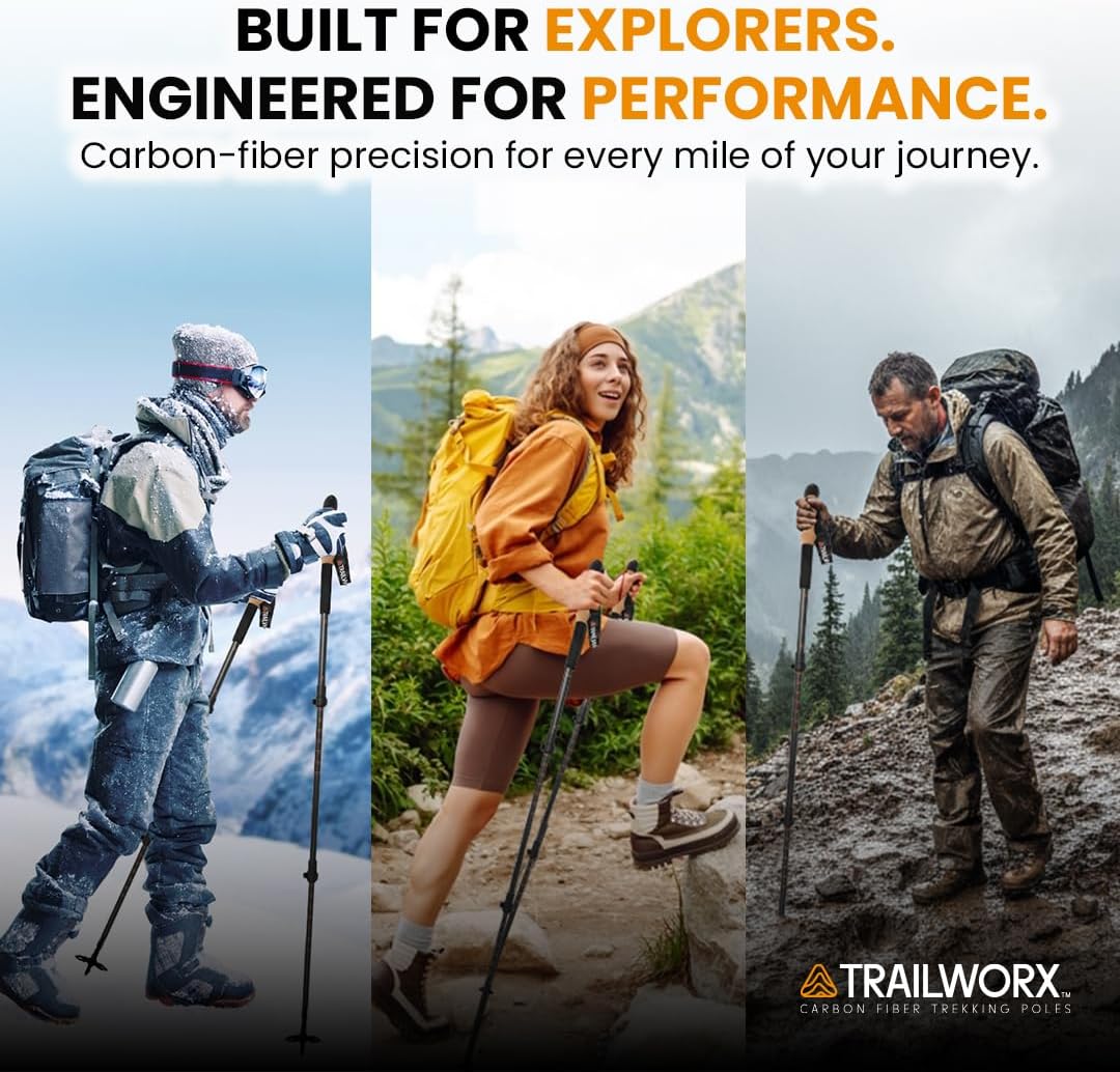 Trailworx Carbon Fiber Collapsible Hiking Poles – Perfect for Hiking, Trekking, and Walking Enhance your outdoor adventures with the Trailworx Carbon Fiber Collapsible Hiking Poles. These lightweight and durable trekking poles are ideal for hiking, trekking, hunting and walking. Featuring ergonomic cork handles and EVA foam grips, they offer superior comfort, making them perfect for both men and women. The adjustable length (24.5″ to 54″) ensures a customizable fit, while the tungsten carbide tips provide excellent traction on various terrains, from rocky trails to soft soil. This complete set includes snow and mud baskets, a carry bag, and storage clips, making them easy to store and carry on any journey. Whether you’re looking for walking sticks for hiking, trekking poles for hiking, or hiking poles for women, these collapsible hiking poles are your go-to solution for a reliable and comfortable hiking experience.
