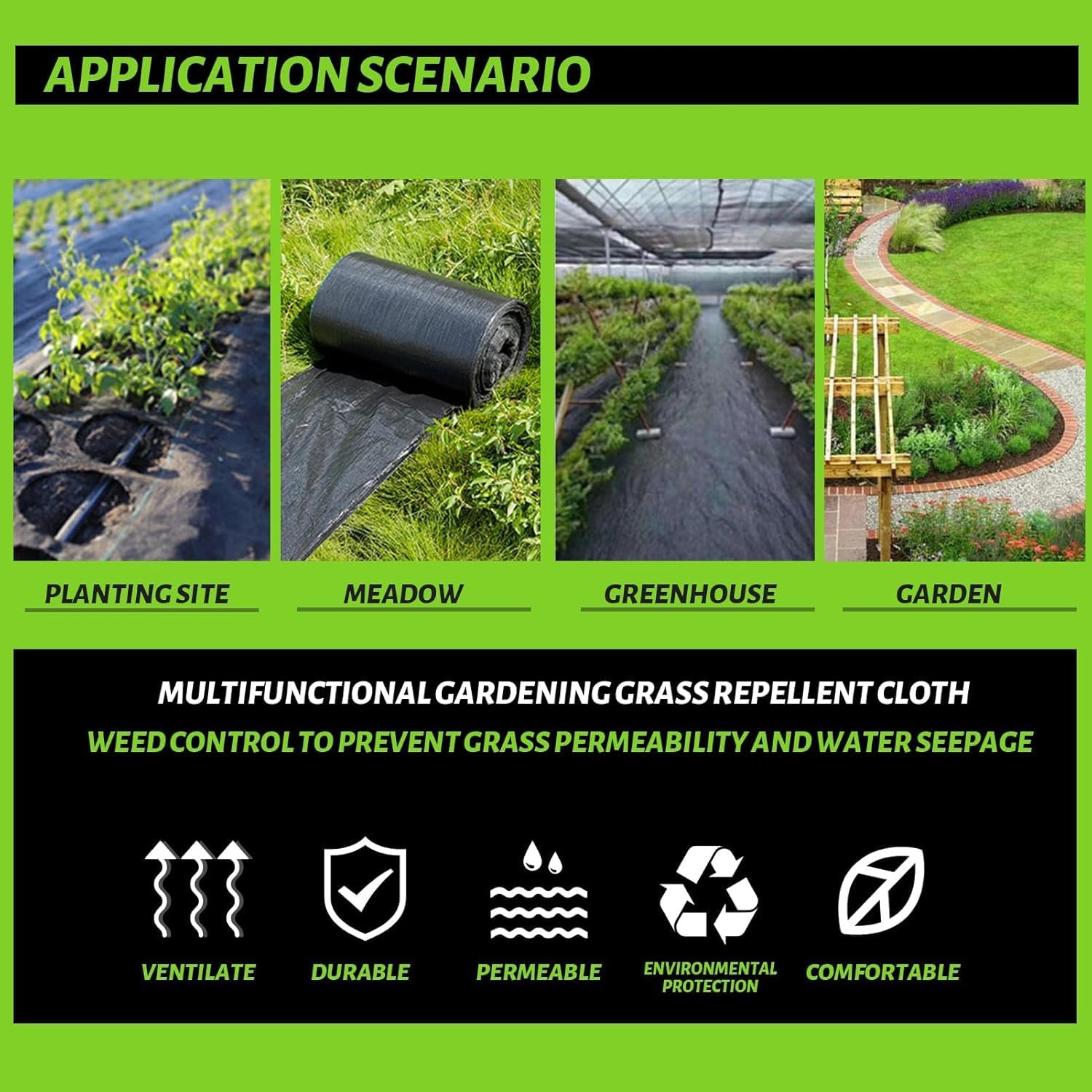 【5. Various Sizes & Wide Application】: We provide landscape fabric of different sizes. It’s suitable for landscaping or outdoor garden projects. For example, narrow weed barriers can be used to flower beds or greenhouses, and wide ones can be used for artificial botanical gardens, ground cover, gravel walkways, flower beds, driveways, and so on.