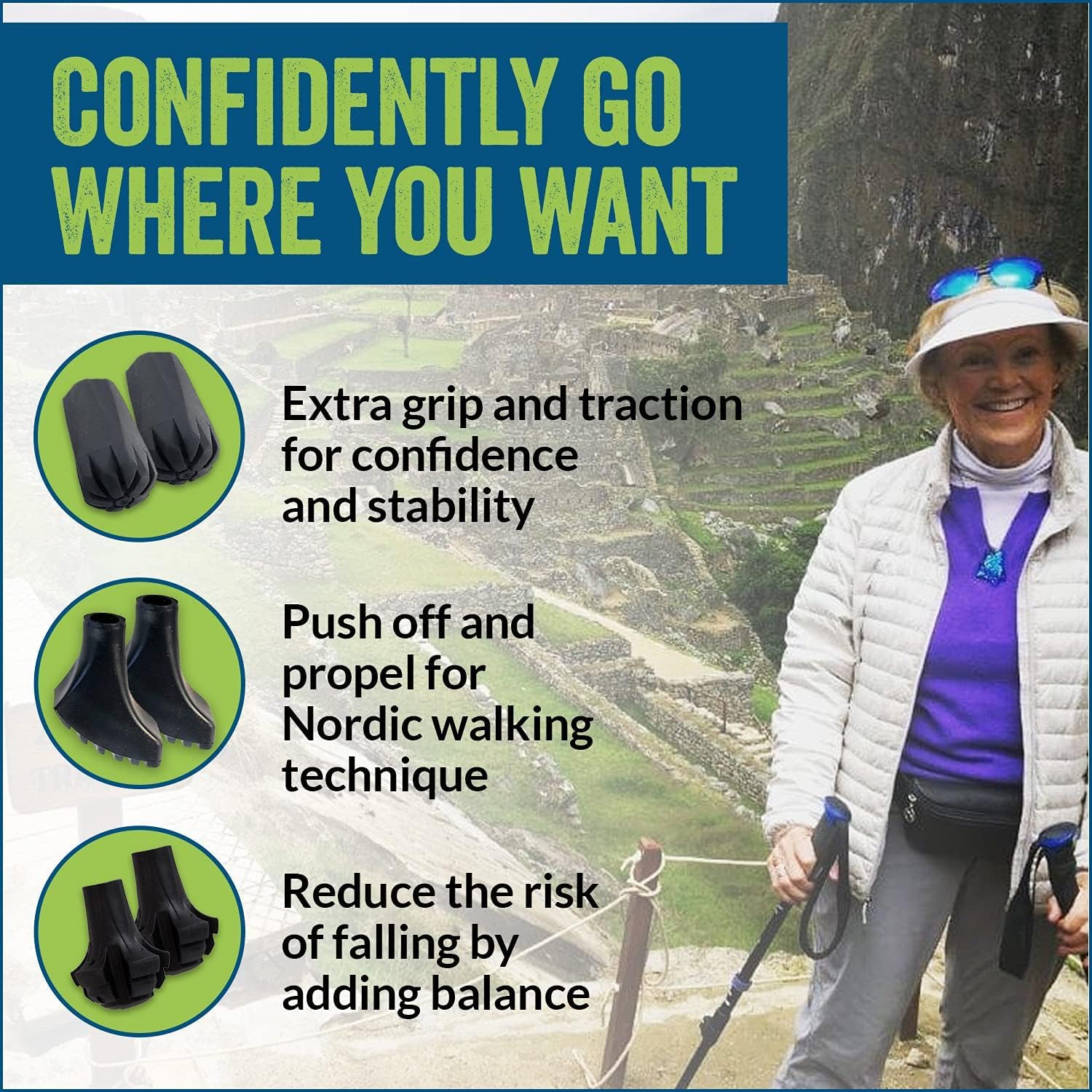 THREE DESIGN CHOICES: Unique design provides stability for all types of hiking and walking. Choose Round for regular walking and hiking. Nordic Medium for power walking with maximum grip OR Extra Firm for a stiffer tip with maximum durability