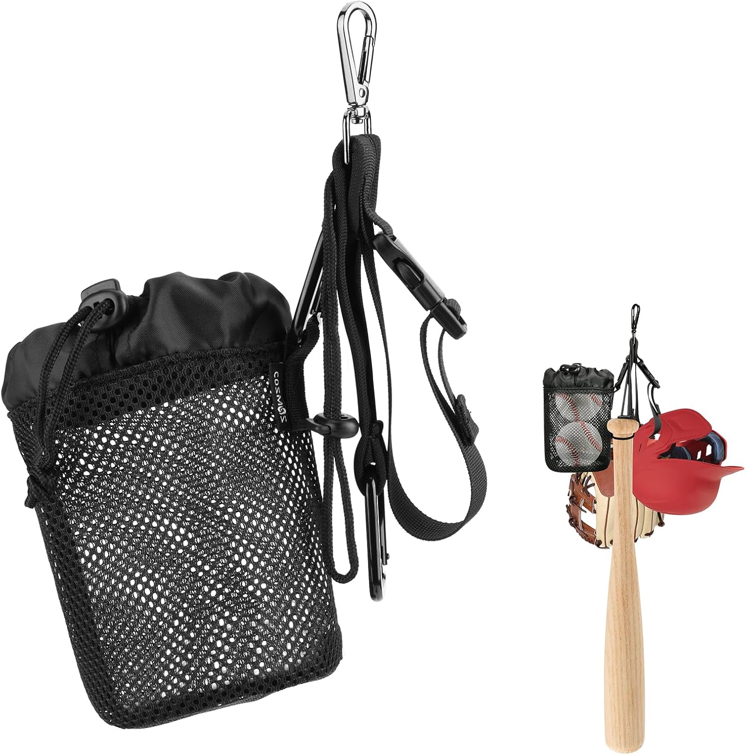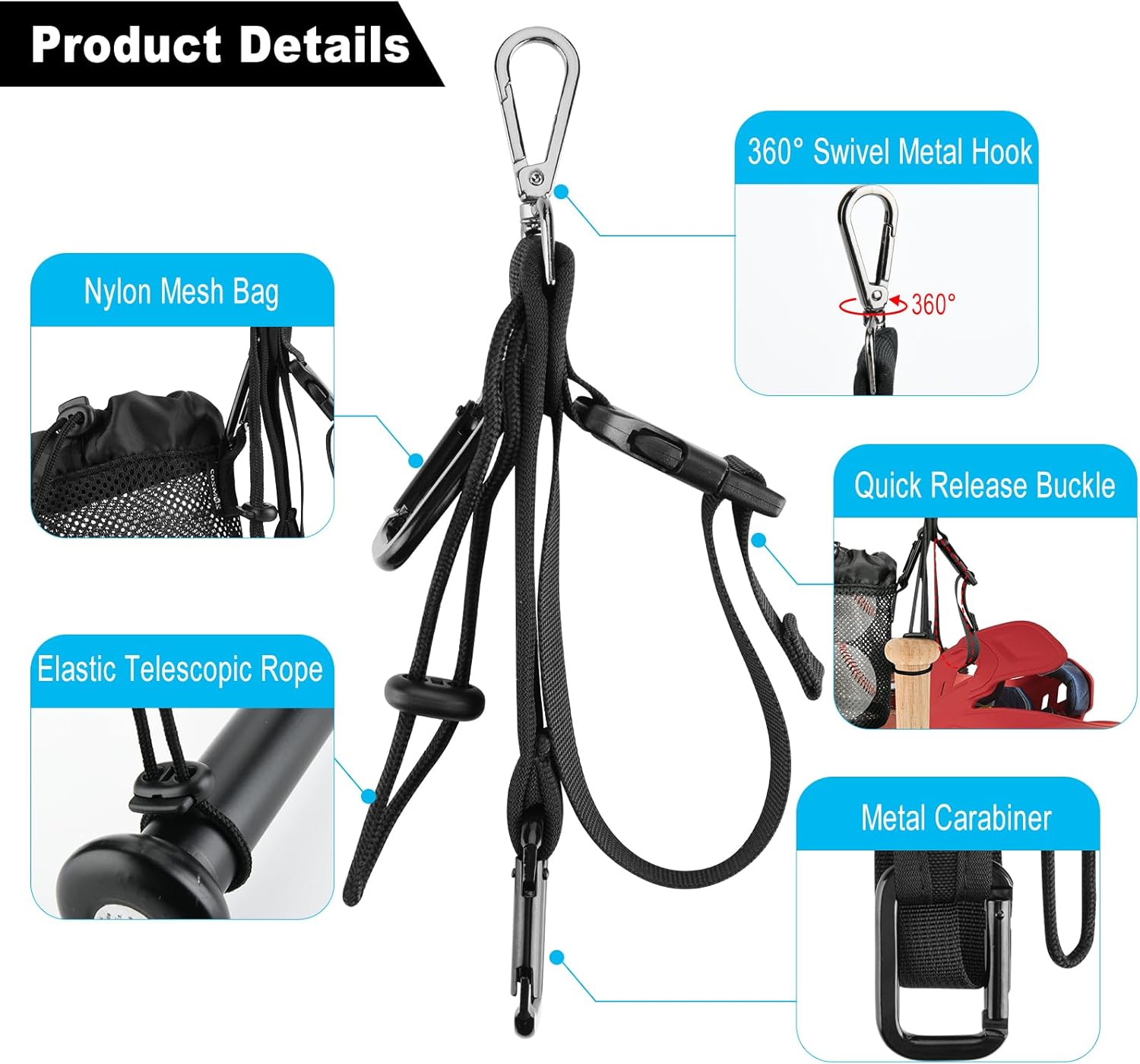4 In 1 DESIGN BASEBALL GEAR HANGER – Our dugout gear hanger is designed with 1 clip on top to attach to a fence or backpack, 1 mesh pocket to store a baseball or badminton ball, 1 adjustable locking cord to hold baseball bat, 1 metal hook to hold a baseball glove or water bottle, and 1 strap with a quick-release buckle to hang your helmet.