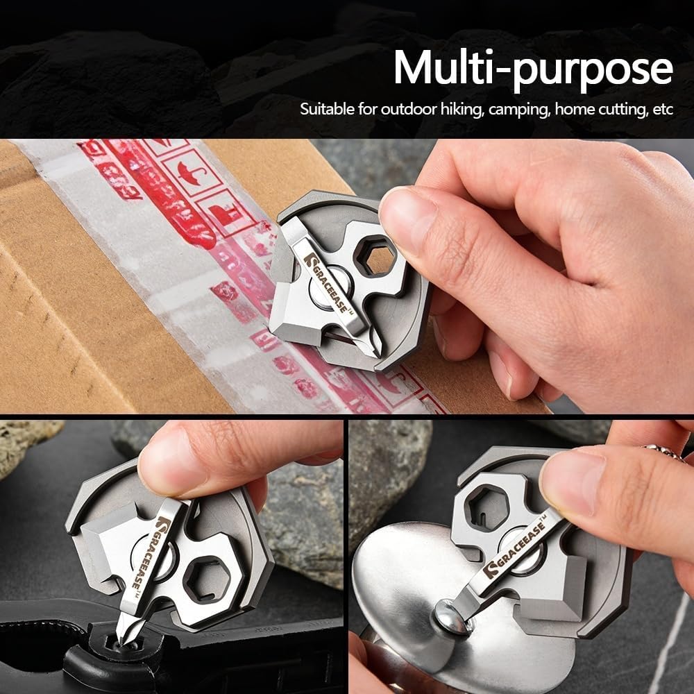This is a GRACEEASE brand rotatable multi-purpose screwdriver with the cutting function of opening express cartons. This box opener is made of titanium alloy base and steel blade. Titanium alloy is famous for its excellent strength, corrosion resistance and lightweight characteristics.It not only can easily cope with a variety of unpacking tasks, but also can maintain performance in wet or complex environments, and will not rust or damage as easily as ordinary knives.Whether it’s an emergency unpacking for outdoor adventure or a frequent use at home, it can be your most reliable partner.