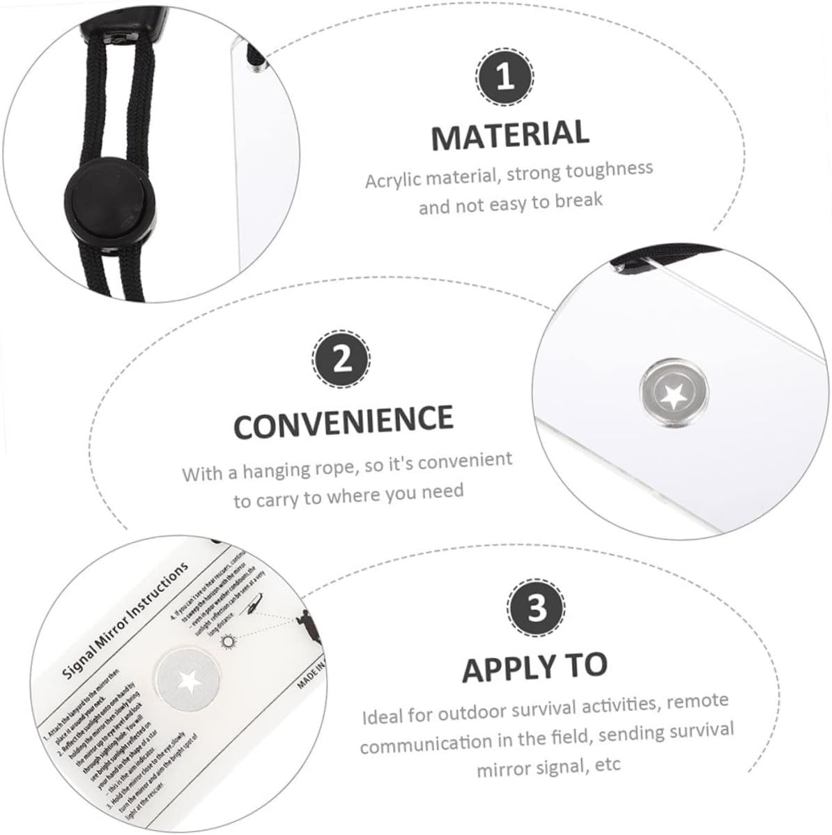 – Lightweight and portable design, so it’s convenient to carry it outside. Compact and small, easy to store, not taking up any space hiking whistle mirror.