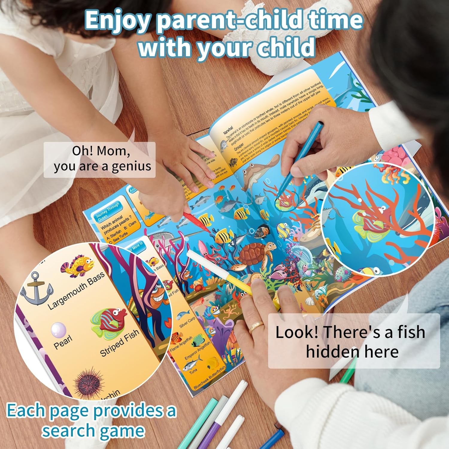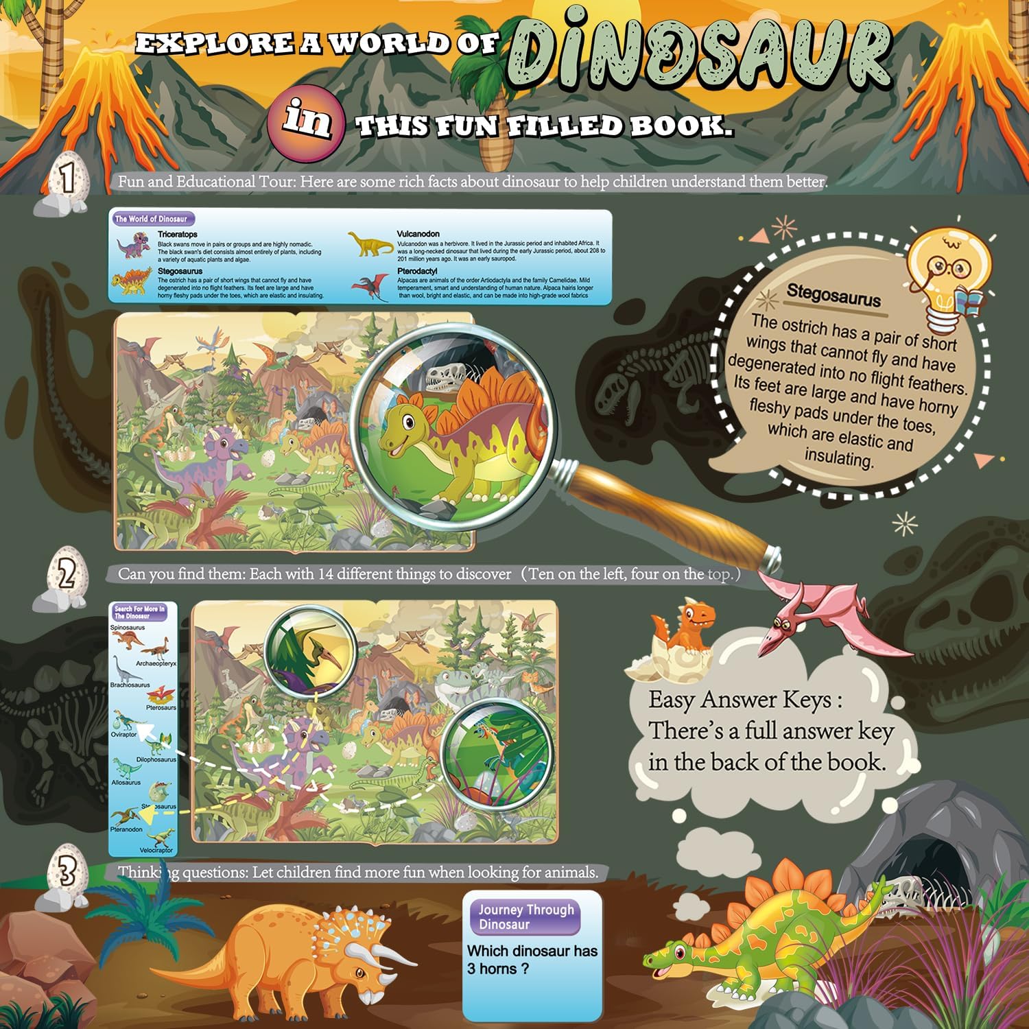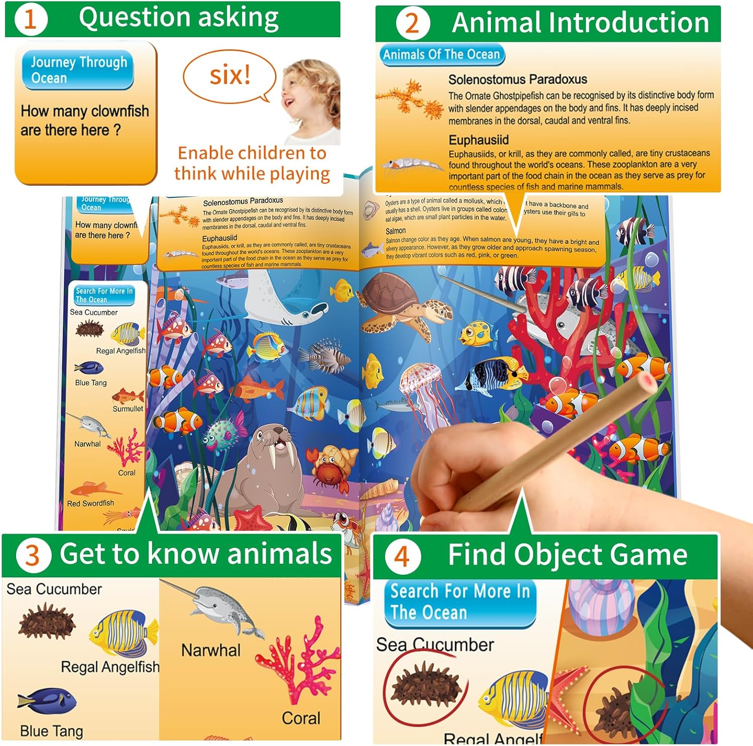 About the Details: Each book covers different scene, and each page contains four parts. Each page has 4 animals explanations,challenge your knowledge of animal and know more fun fact. And 10 different animal or things to discover in the scene,and find the hidden object. We also have a question for kids to think during they play.(The back of the book has an answer key for where the animals and question)