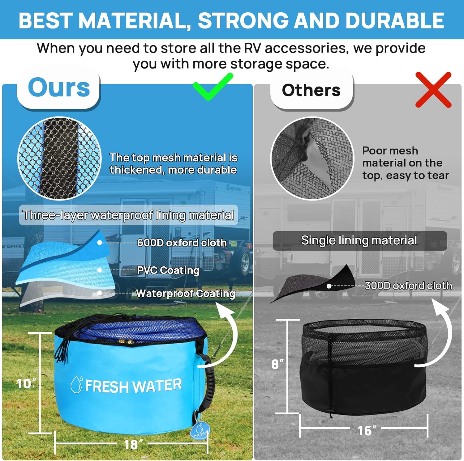 【MORE STORAGE SPACE】 Our bag size is 18×20 inches ( 10 inch waterproof liner + 10 inch mesh ). Our bag is the perfect size for all storage configuration sizes, provide you with enough space to store your 100ft fresh water hose, sewer hose , all you electrical cords. You can use them not only to organize your RV life, but also your garage, storage, basement, shed, workshop, etc. Every family will love a practical gift like this.