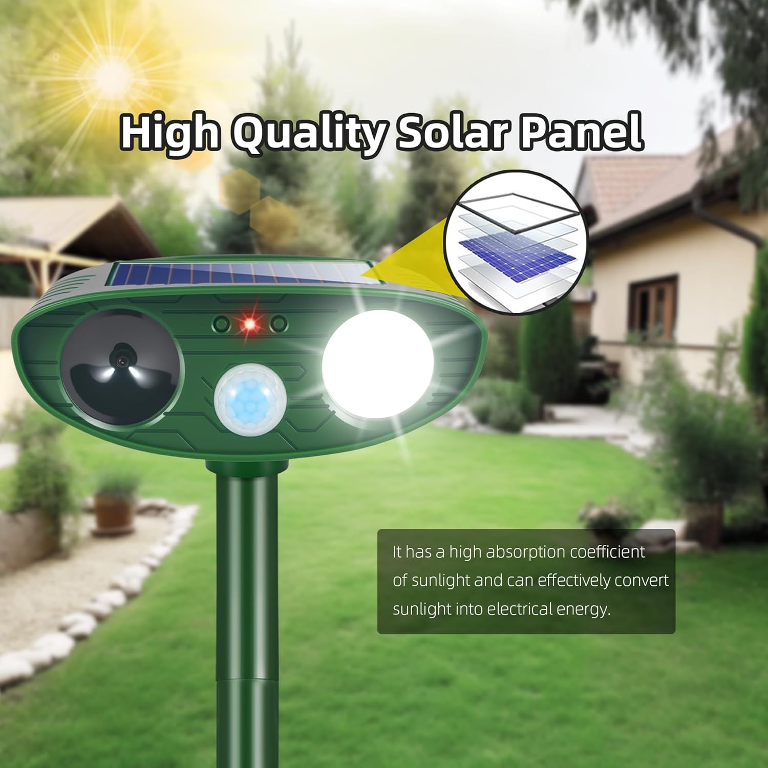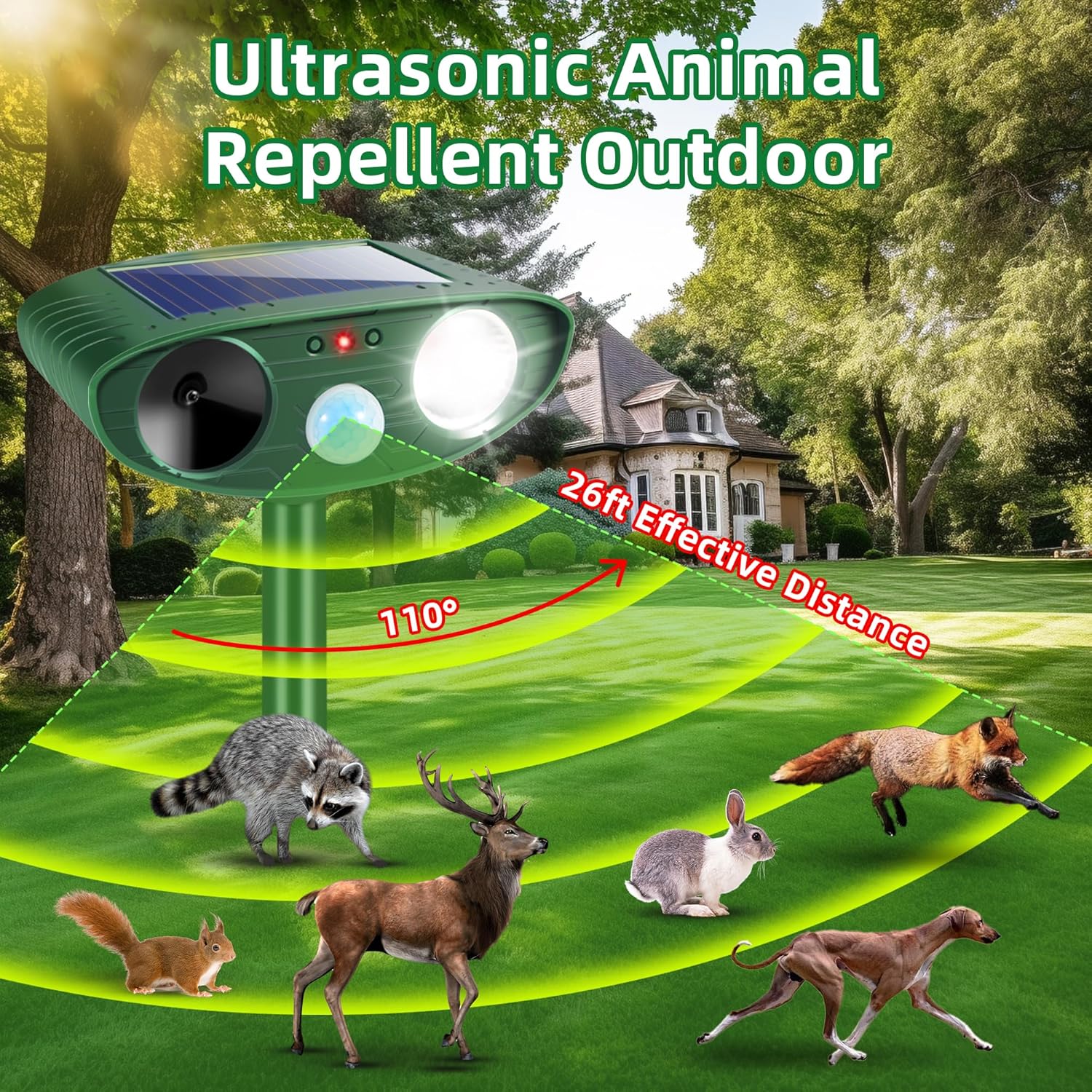 Advanced PIR Motion Detection: This 2025 solar animal repeller detects movement within a 110-degree arc and up to 26 feet, emitting ultrasonic waves and flashing LED light to scare away animals like dogs, cats, deer, raccoons, skunks and squirrels from your yard or garden