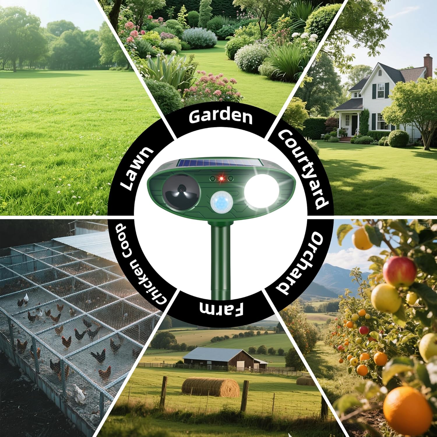 Multi-Location Installation: Install easily on fences, walls, or the ground. The ultrasonic animal repeller outdoor is used for patios, gardens, farms, lawns and orchards, deterring a variety of animals including deer, rabbits, raccoons, and stray animals. Position it effectively by ensuring the unit is 9-10 inches above ground for optimal results