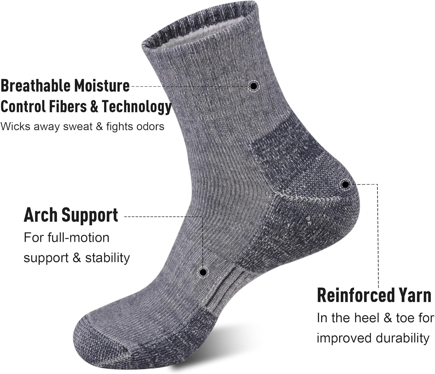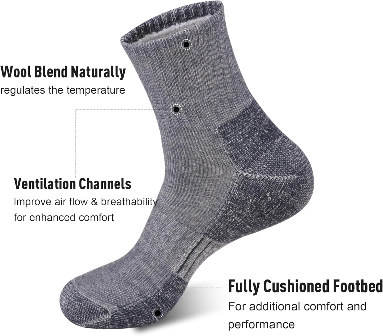 This sock contains 72% Merino wool, and more wool fiber means more heat is locked in, resulting in more significant warmth retention. It is very suitable for hiking in cold weather. Wool fibers are soft and comfortable, keeping your feet warm and comfortable even during long hiking trips.