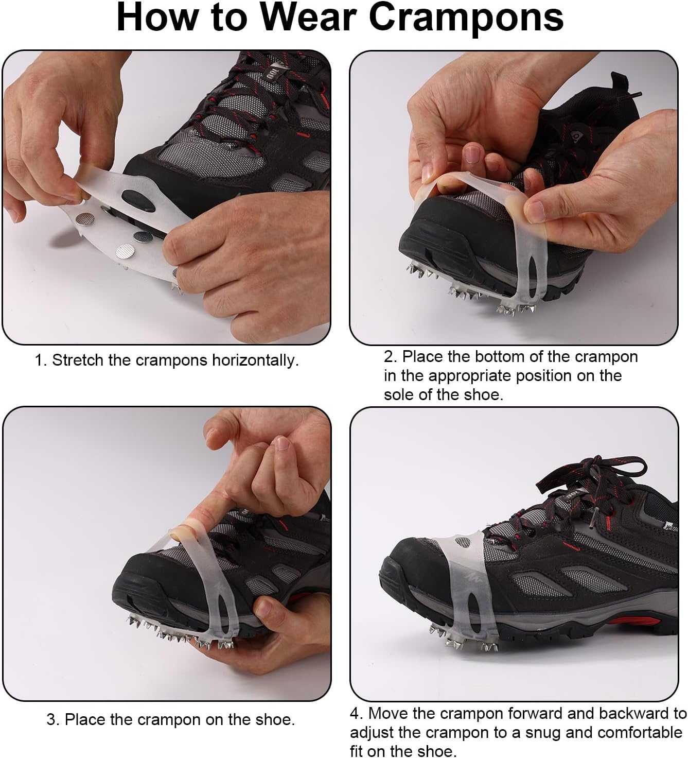 Package Content: You will receive four crampon cleats, suitable for all types of shoes, including hiking boots, sneakers, skateboards, and snow boots.