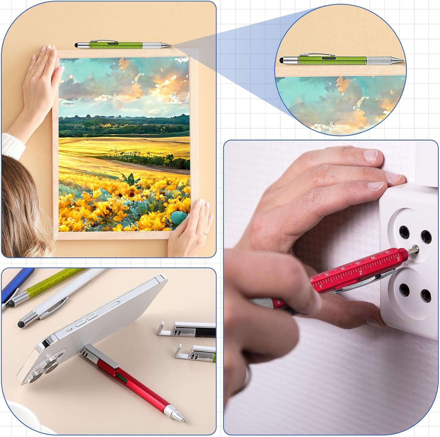 6 in 1 Tool Pens: the multitool pen measures about 5.9 inch/ 15 cm, providing a comfortable grip and impeccable writing, and features a ballpoint pen for jotting down notes, a stylus for use, a ruler for quick measurements, a flathead screwdriver, a Phillips head screwdriver, and a level for precise measurements