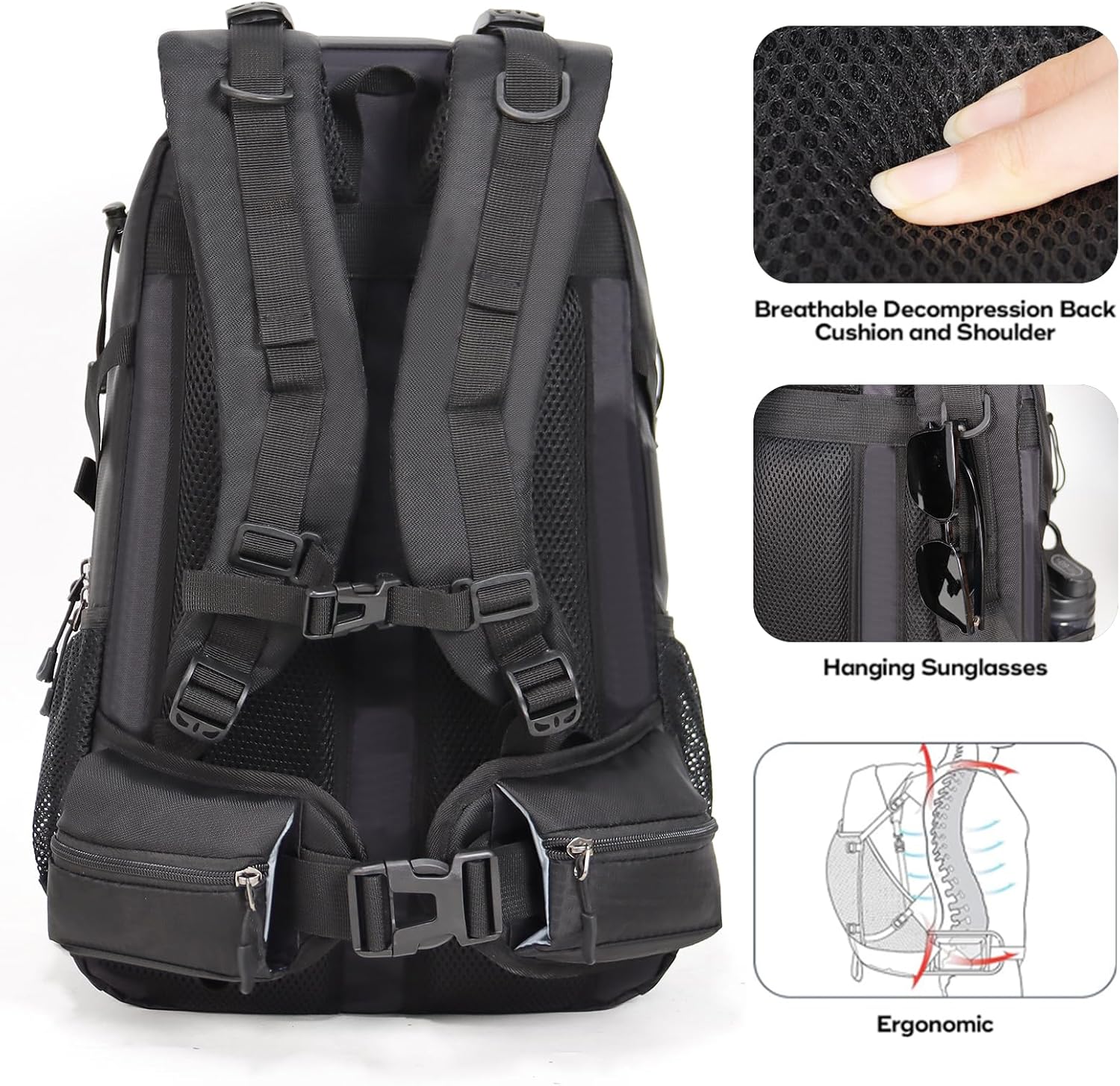 Unique Function Design: The camping backpack is printed with reflective signs to remind safety. The sides of the backpack have elastic and fasteners that can hold two sets of trekking sticks and adjust the webbing according to needs.