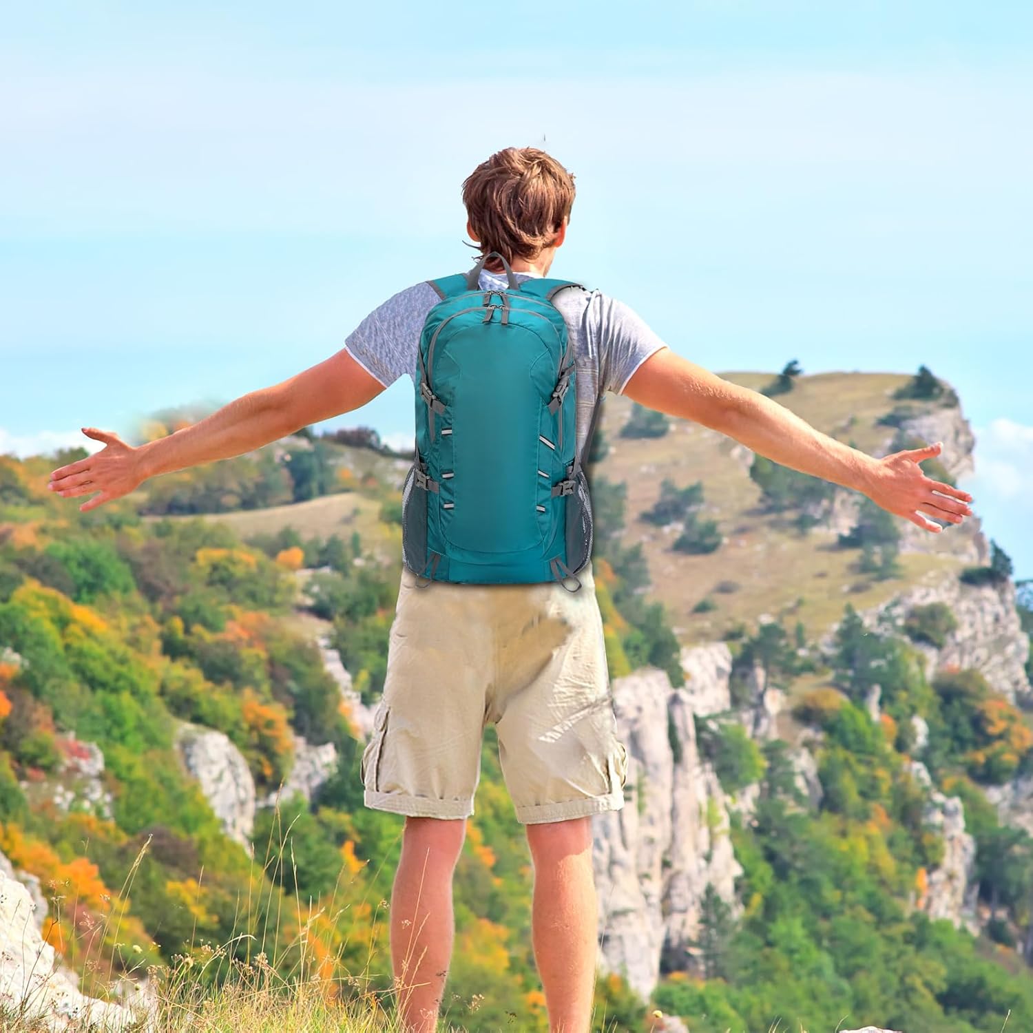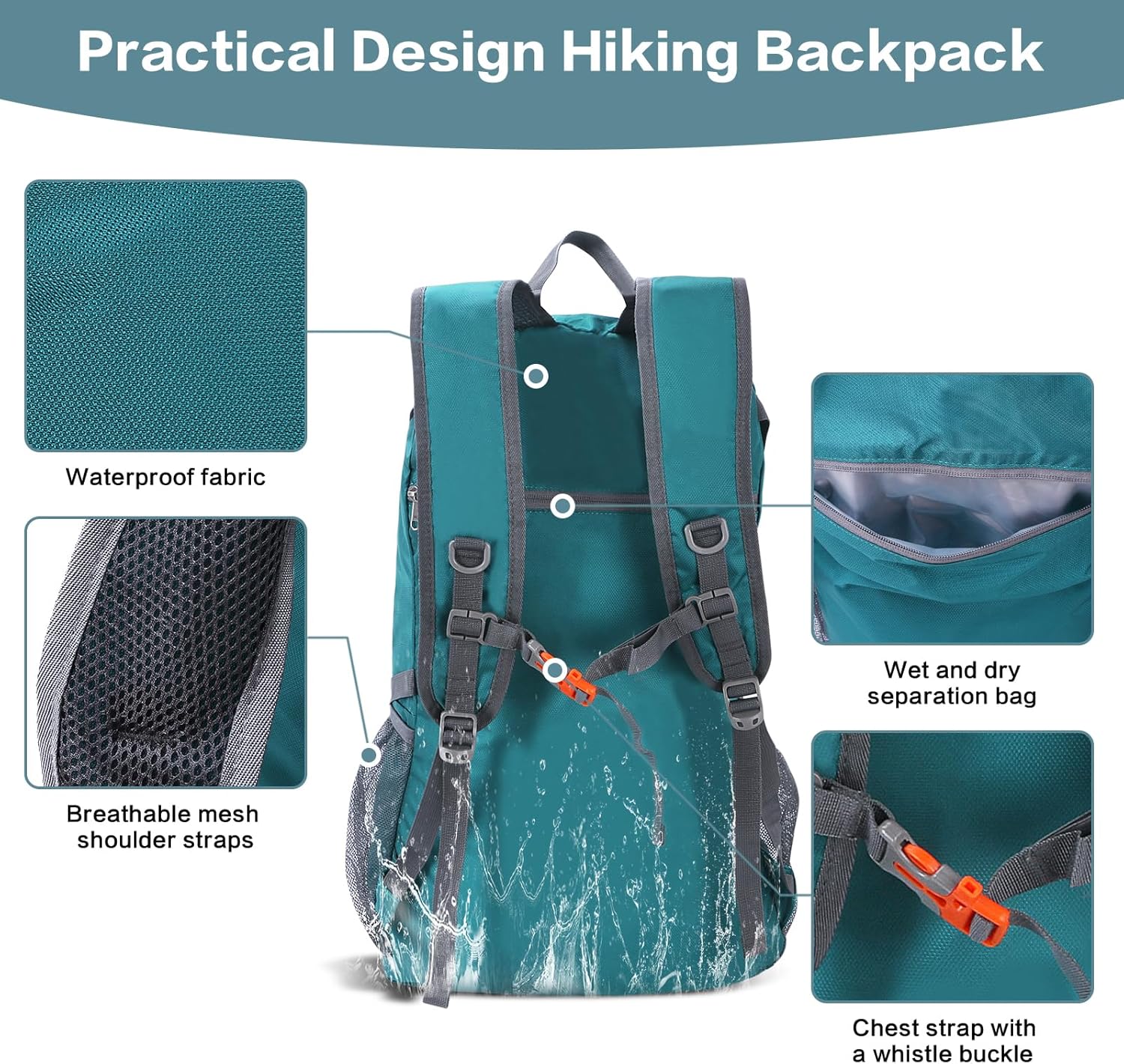 【Lightweight & Foldable】This lightweight trekking backpack only 1 pound, unfold size: 20.8*13*7.8inch, fold size: 9.45×8.66inch, it can fold easily into its own pocket for storage and unfold when needed, a true space saver. Breathable widened S-type shoulder straps with comfortable sponge padding help relieve the stress from your shoulder. The adjustable chest strap with a whistle buckle helps you distributes the weight of the packable hiking backpack and keeps it stable and centered.