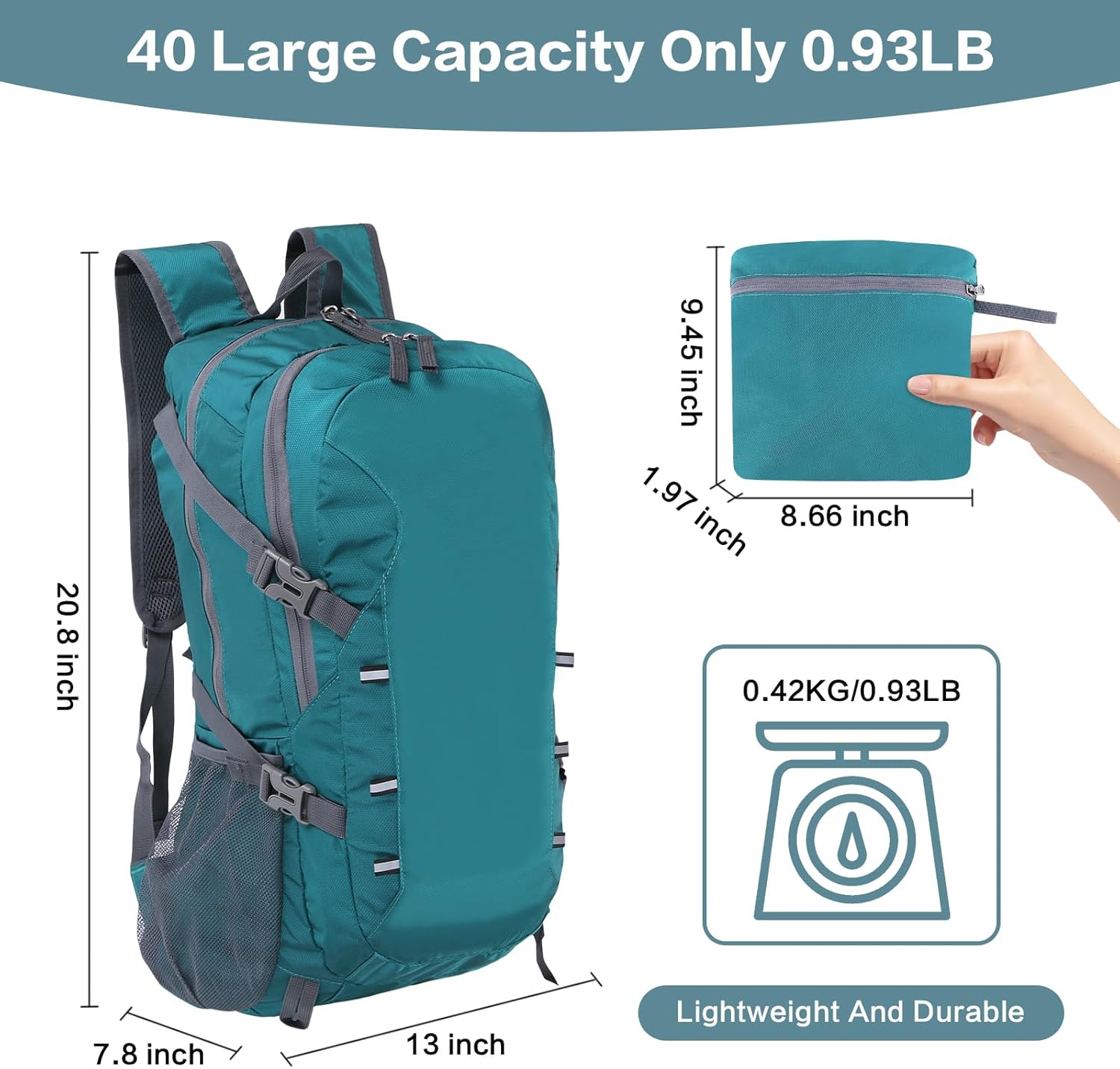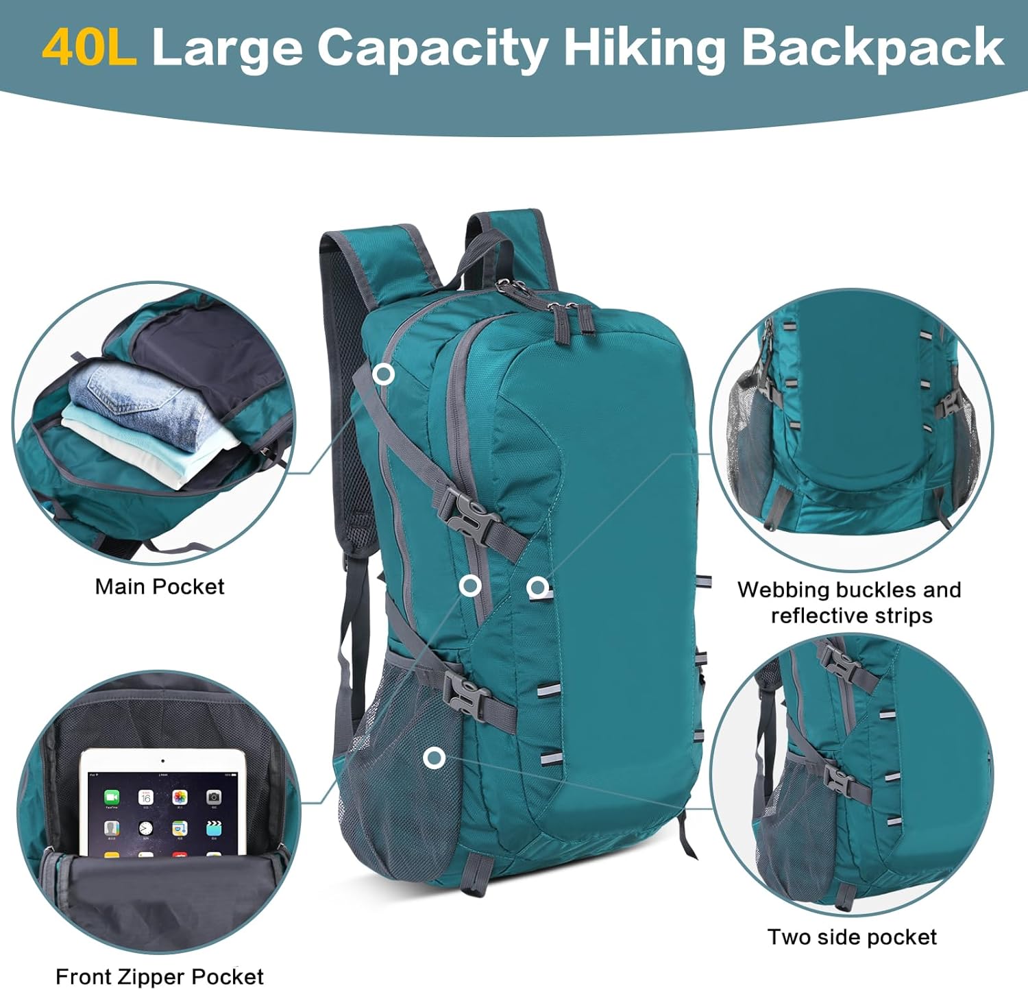 【Multi-Compartment Design】This foldable backpack has 40L storage space. This backpack features with multi-compartment design includes 1 main zipper compartment, 1 zipper front pockets, 2 side pockets, and one back zipped hidden waterproof wet pocket. One small zippered pocket in the main compartment, two small net pocket in the zipper front pockets. It can easy organize your travel essentials or daily items.