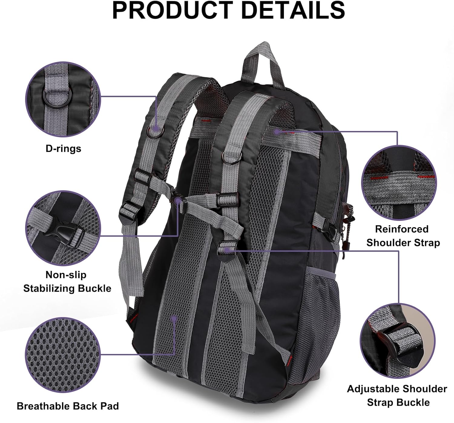 Waterproof Hiking Backpack. Made of lightweight polyester material with gliding smoothly zippers, allows you convenient access to your stuff. Meanwhile the breathable shaped padded shoulder strap and back panel is extremely comfortable and lightweight, which will release heat rather than accumulate. An earphone hole on the side enables you to enjoy music easily.
