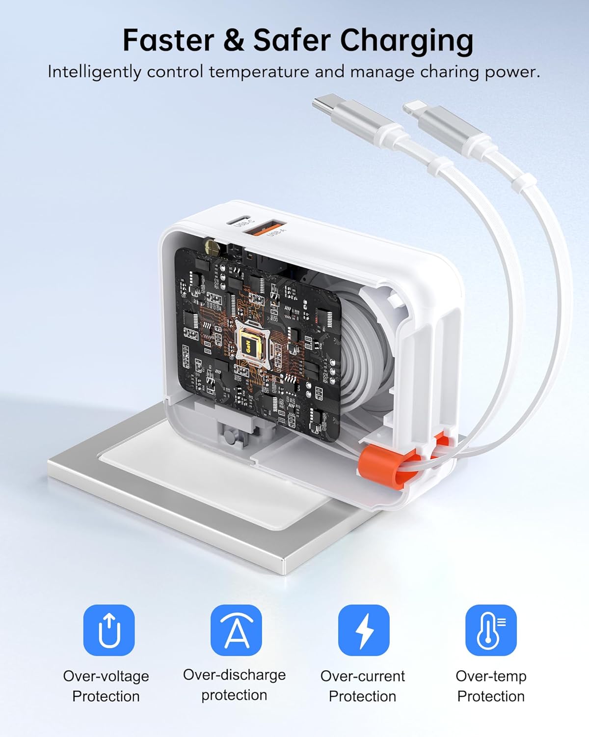Safe & Efficient Charging Cube : This fast retractable usb c charger is equipped with the latest GaN technology, integrated with a smart microchip, which can automatically match the current required by the device, providing overcharge, overcurrent, overvoltage, overheating, short circuit protection functions.The shell is made of ABS + PC fireproof material, our multi port charger block complies with strict safety standards, guaranteeing reliable and worry-free usage.