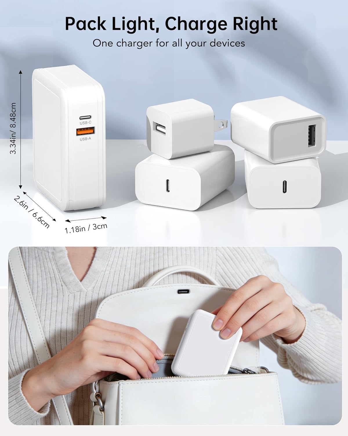 Travel Essentials iPhone Charger: This portable charger block measures 2.4 x 2 x 1.5 inches and weighs 4.62 ounces.Its ultra-compact design, complete with rounded edges, retractable cables, and foldable plug, making it 30% smaller than other 4-port retractable chargers and prevents scratches on other items in your bag.Due to compact body design,the fast charging becomes a trip essentials and perfect as an ideal companion for travel, office or home.