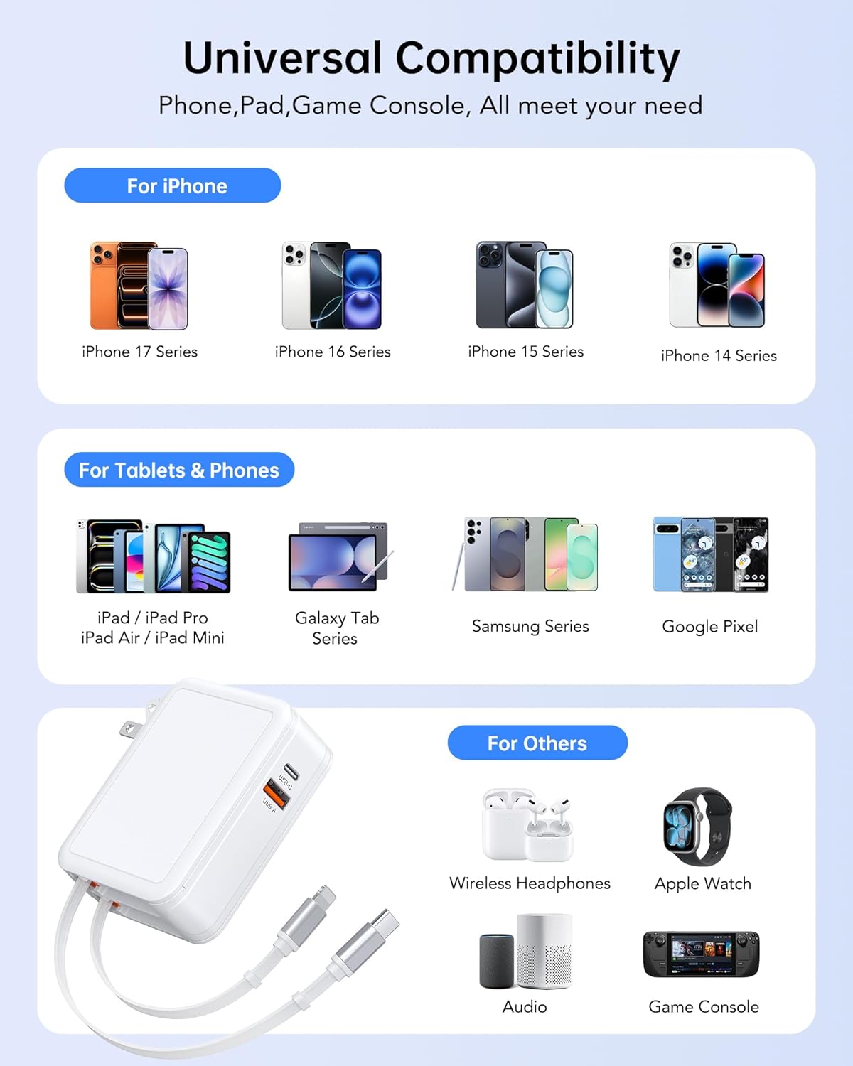 Universal Compatibility Wall Charger:Equipped with two retractable cables and two ports, this retractable charger block is compatible with nearly all electronic devices, including iPhone 17/17Air/17Pro/17 Pro Max, 16/16 Pro/16 Pro Max/15/14/13/12, iPad Air/Pro/Mini, AirPods Pro, Samsung Galaxy /Note, LG, Motorola, Google Pixel, Switch, and other digital devices.