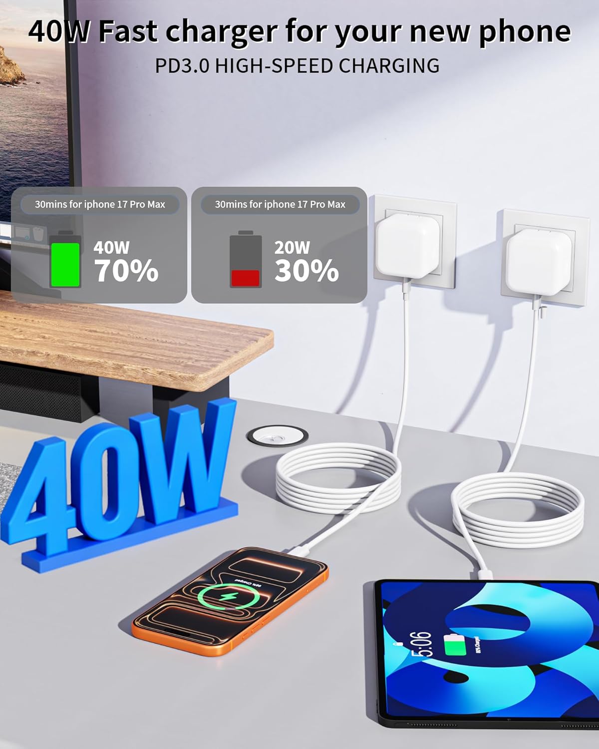 Apple 40W Dynamic Power Adapter:As a professional Apple 40W Foldable Charger,this USB-C PD 3.0 adapter provides 40W of power and the maximum power can reach 60W.Charge your iPhone 17 Pro Max from 0% to 70% in just 30 minutes,6x faster than the original 5W charger,saving over 1 hour of waiting time.The dynamic power allocation technology ensures stable charging for both your phone and iPad,making it the ideal daily charger for Apple users.