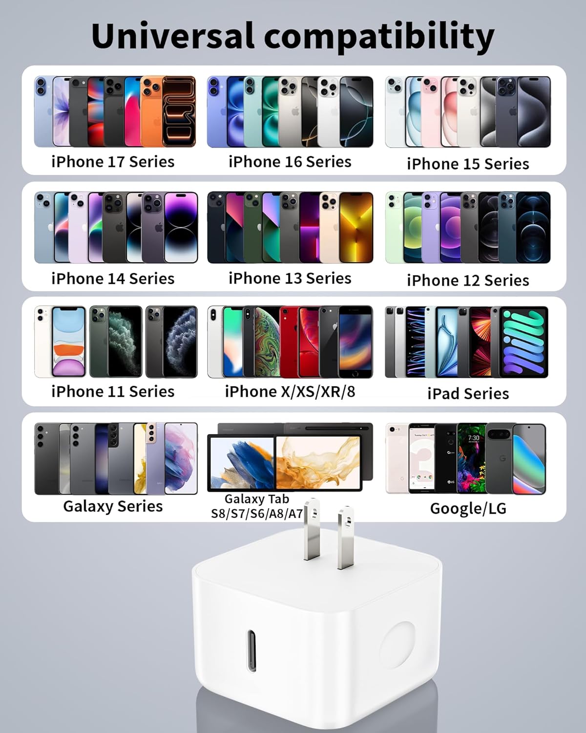 Universal Compatibility for Apple:This Apple USB C Charger is fully compatible with all Apple devices:iPhone 17/17 Pro/17 Pro Max/16 Pro/16/ 16 Pro Max/16 PLUS 15/15 Pro/ 15 Pro Max/ 15 Plus/14/14 Pro/ 14 Pro Max/ 14 Plus/13/12/11/X/XR/XS/8/8 Plus,iPad,Apple Watch Ultra and AirPods Pro.It also works seamlessly For Samsung Galaxy S24/S23,Google Pixel 7/8 Pro,MacBook Air,and most USB-C enabled phones/tablets,this 40W Dynamic charger meets all your charging needs.