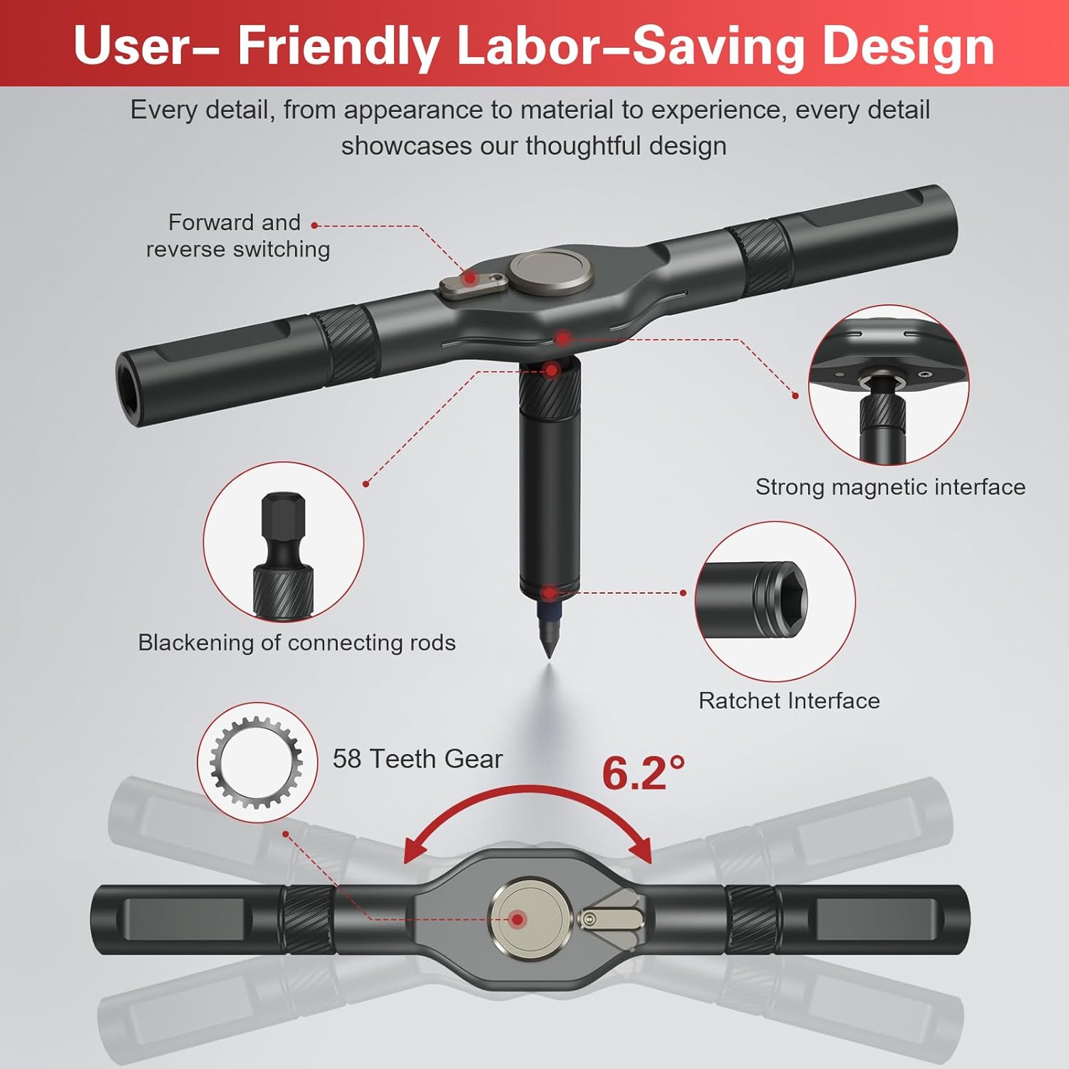 Effortless Ratcheting Mechanism – Equipped with a 6.2-degree ratchet and 58-tooth forward-reverse ratchet mechanism, offering 80% effort savings. With a 50N.m torque, Bomivoi ratcheting screwdriver set tool makes it simple to tighten or loosen screws without wrist adjustments, saving time and effort in every repair job.