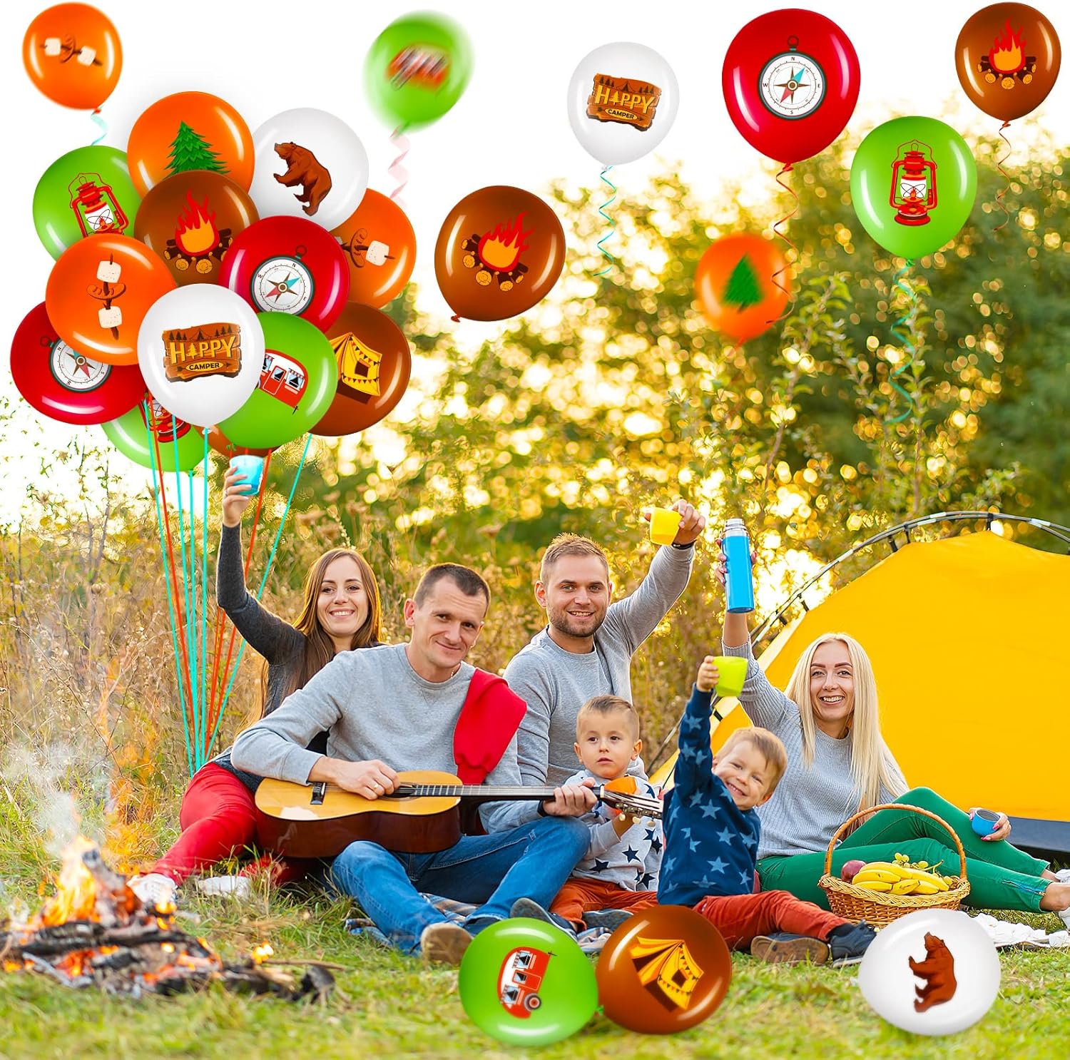 Stylish Design: the camper balloons pattern has a variety of designs, there are 9 different camping-themed patterns, featuring elements such as dining cars, campfires, trees, compass, tents, CAMPER board, oil lamps, skewers, bears, will add more vibrant colors to party decor
