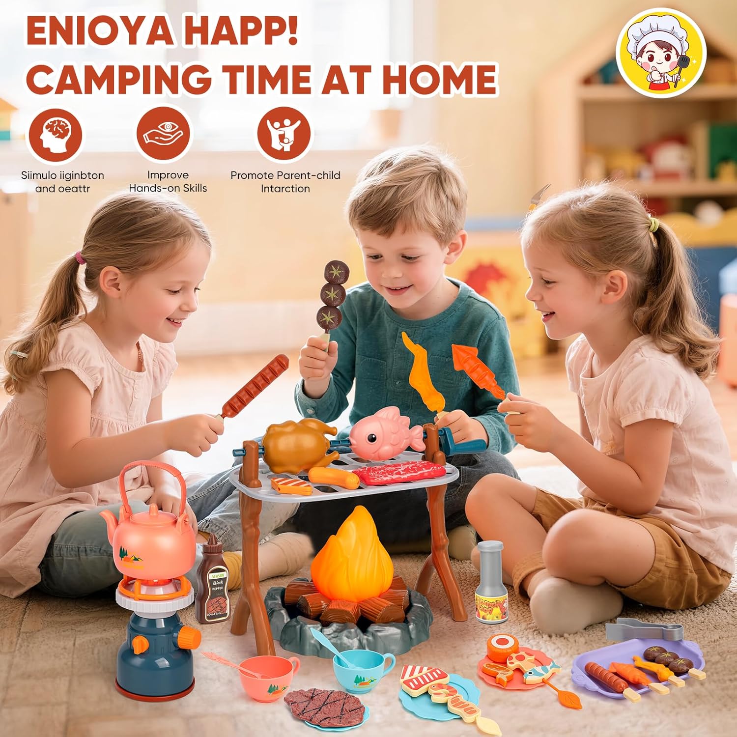 Immersive Camping Adventure for Kids:Camping Pretend Play Set with LED Campfire & Stove – Spark imagination with realistic flickering campfire effects and ambient stove lighting, recreating an authentic outdoor experience without real flames! Safe, engaging, and perfect for nurturing creativity through imaginative role-play. Ideal for indoor/outdoor adventures.