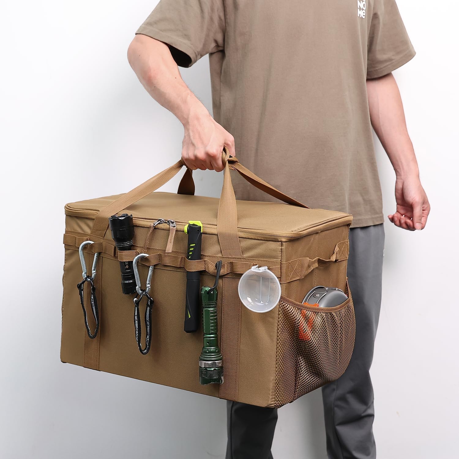 Our camping storage bag has a huge main pocket and you can use the two divider plates to get the room you need. there are two mesh pockets on the top of the bag to hold your small items, for example, your mobile phone and wallet. You can carry our tactical storage bag with the handle, or you can leave our bag in the trunk as a trunk organizer.