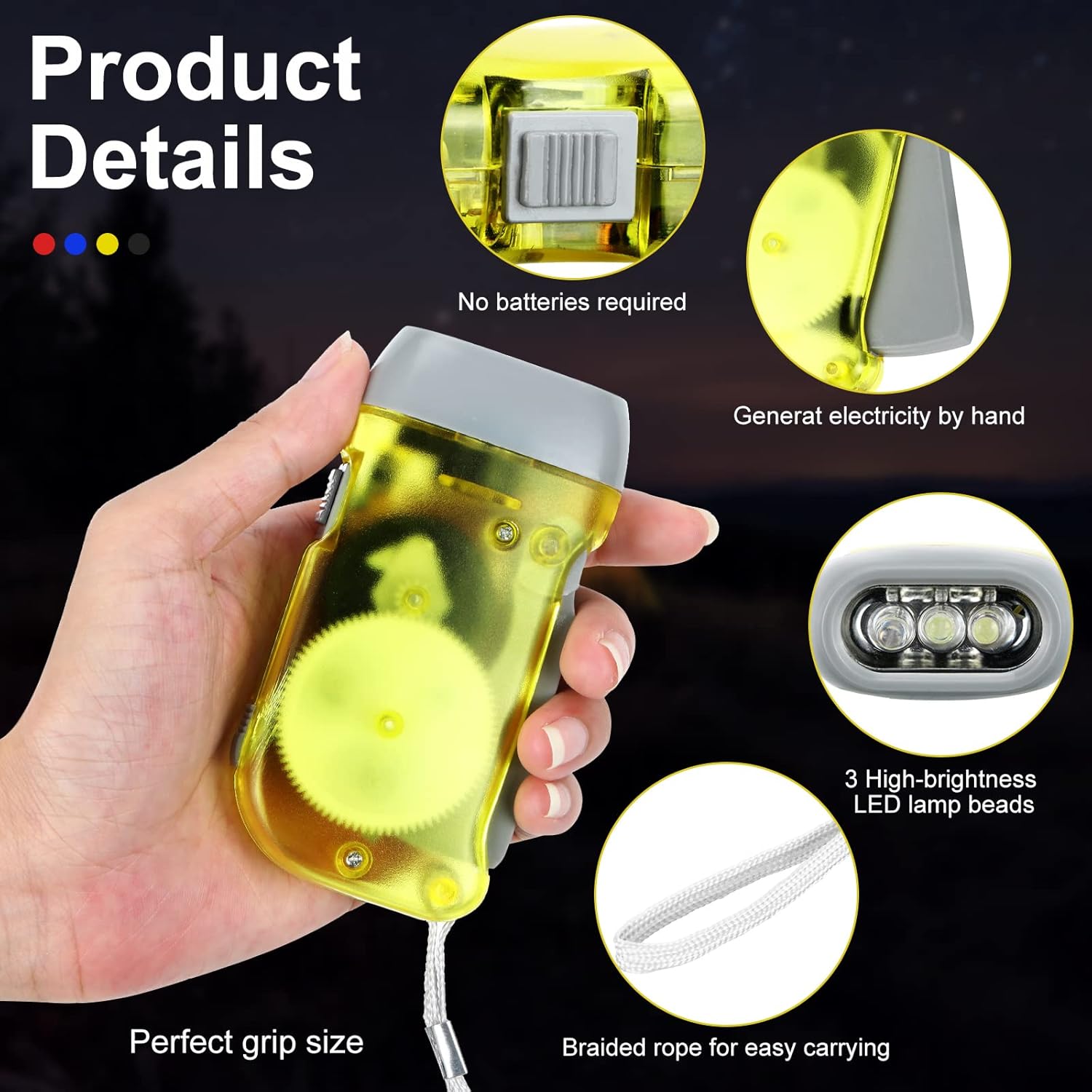 Value Package: you will get 48 hand crank LED flashlights in 4 colors, namely red, blue, yellow and gray, each color has 12; Ample quantity and various colors can meet your use and replacement needs in daily life, you also can share them with your family, friends and neighbors