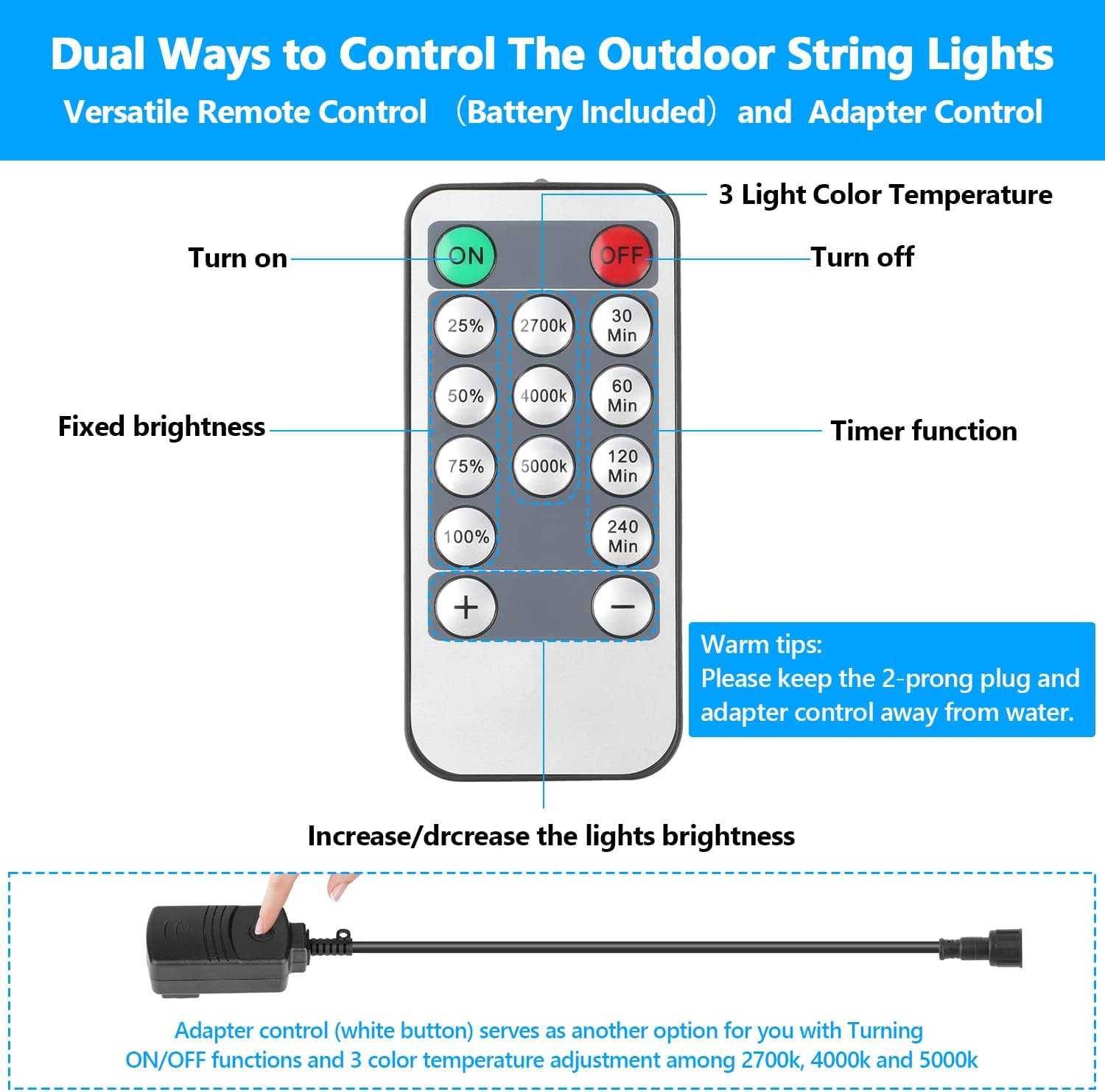 Upgraded 3 Color Dimmable LED Outdoor String Lights for Patio. These commercial LED string lights feature 3 colors in one: 2700K warm white, 4000K natural white, and 5000K daylight white, perfect for various occasions like Christmas, weddings, parties, and reunions